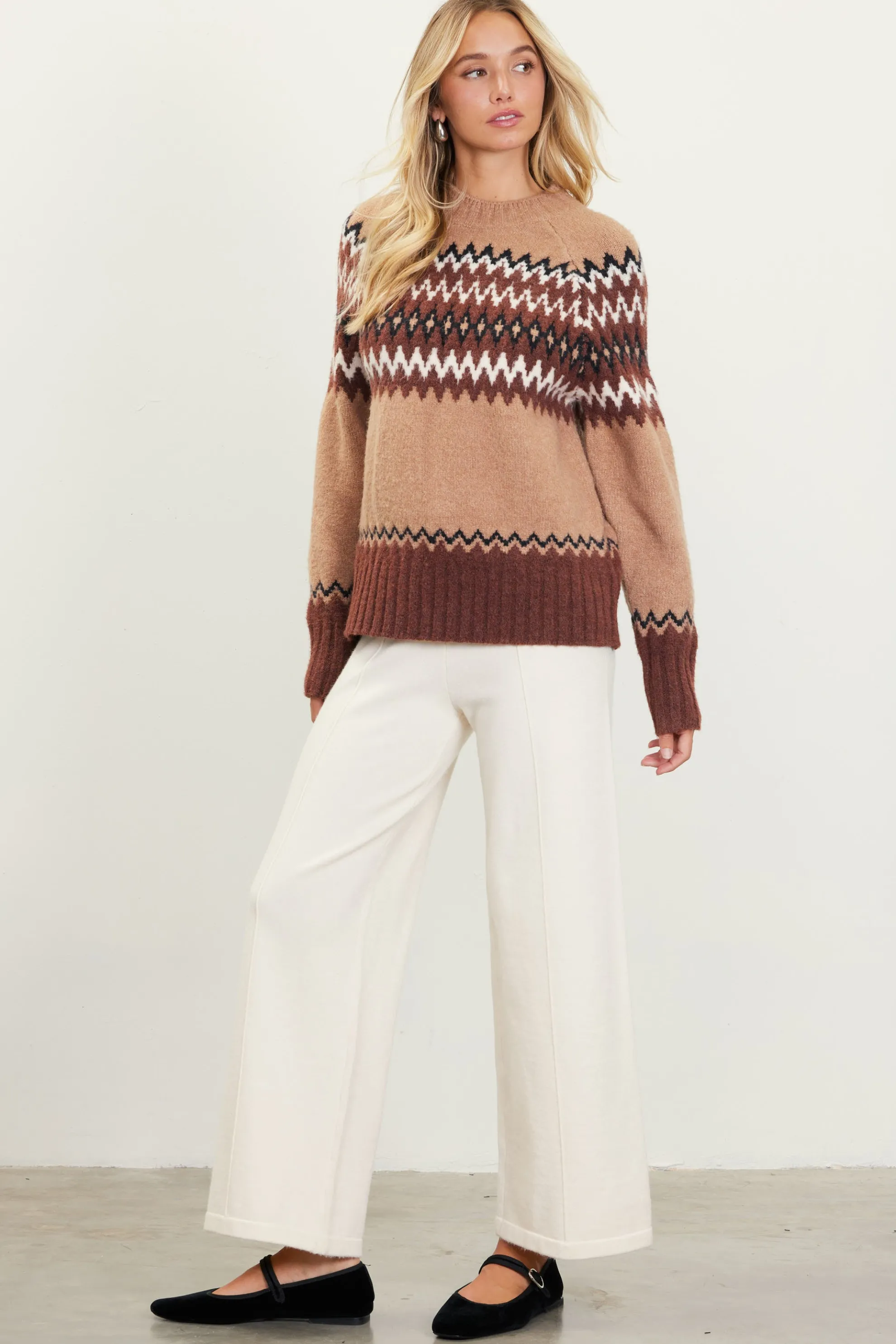 A fair isle sweater to keep you warm and cozy. Knitted with a zigzag pattern, the crewneck style has a relaxed fit, raglan sleeves, and chunky ribbed stitching at the edges.