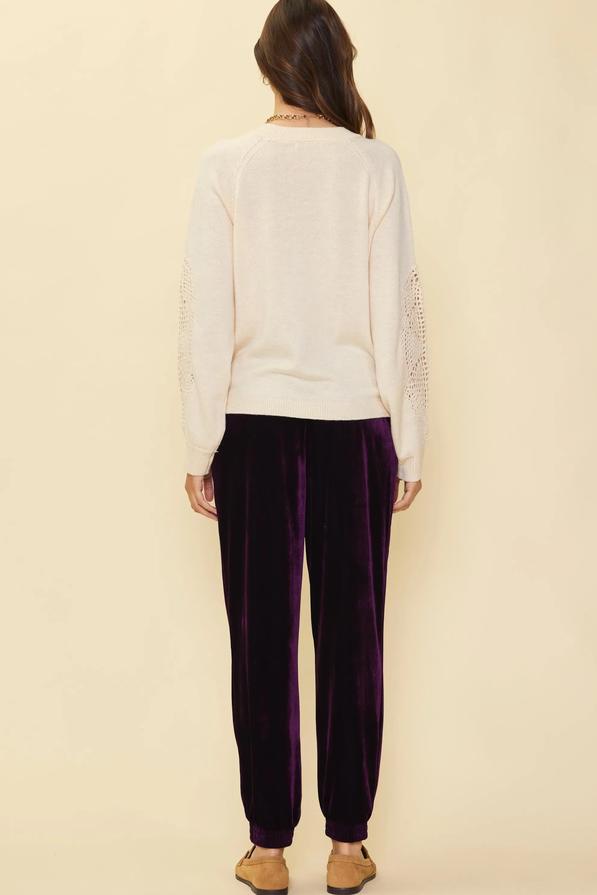 This V-neck sweater is a highlight of the season thanks to the open crochet detailing at the sleeves. The relaxed shape is defined by a V-shaped neckline and gently gathered shoulders, plus ribbed edges to finish.