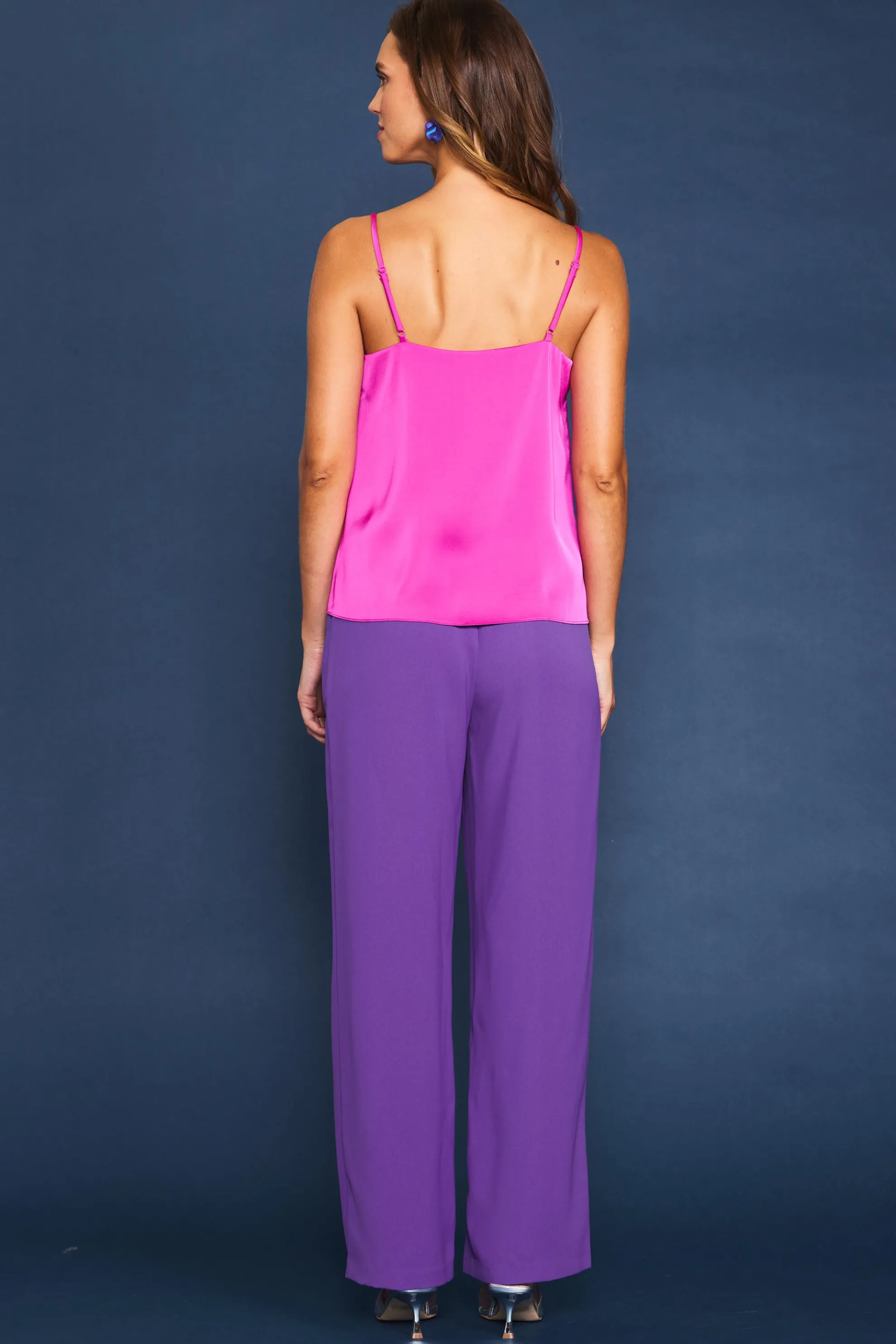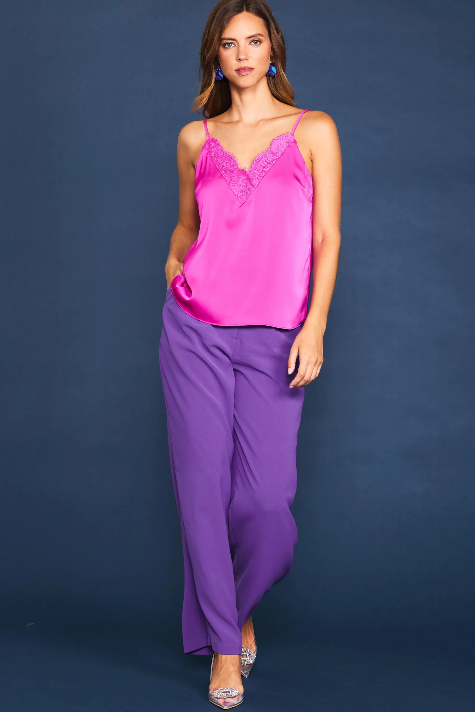 This slinky cami top is a wardrobe essential that you can wear with a multitude of outfits. Adorned with delicate eyelash lace along the neckline, the strappy design is exceptionally versatile, whether worn as a standalone piece or as a base layer for sweaters, blazers, and jackets.