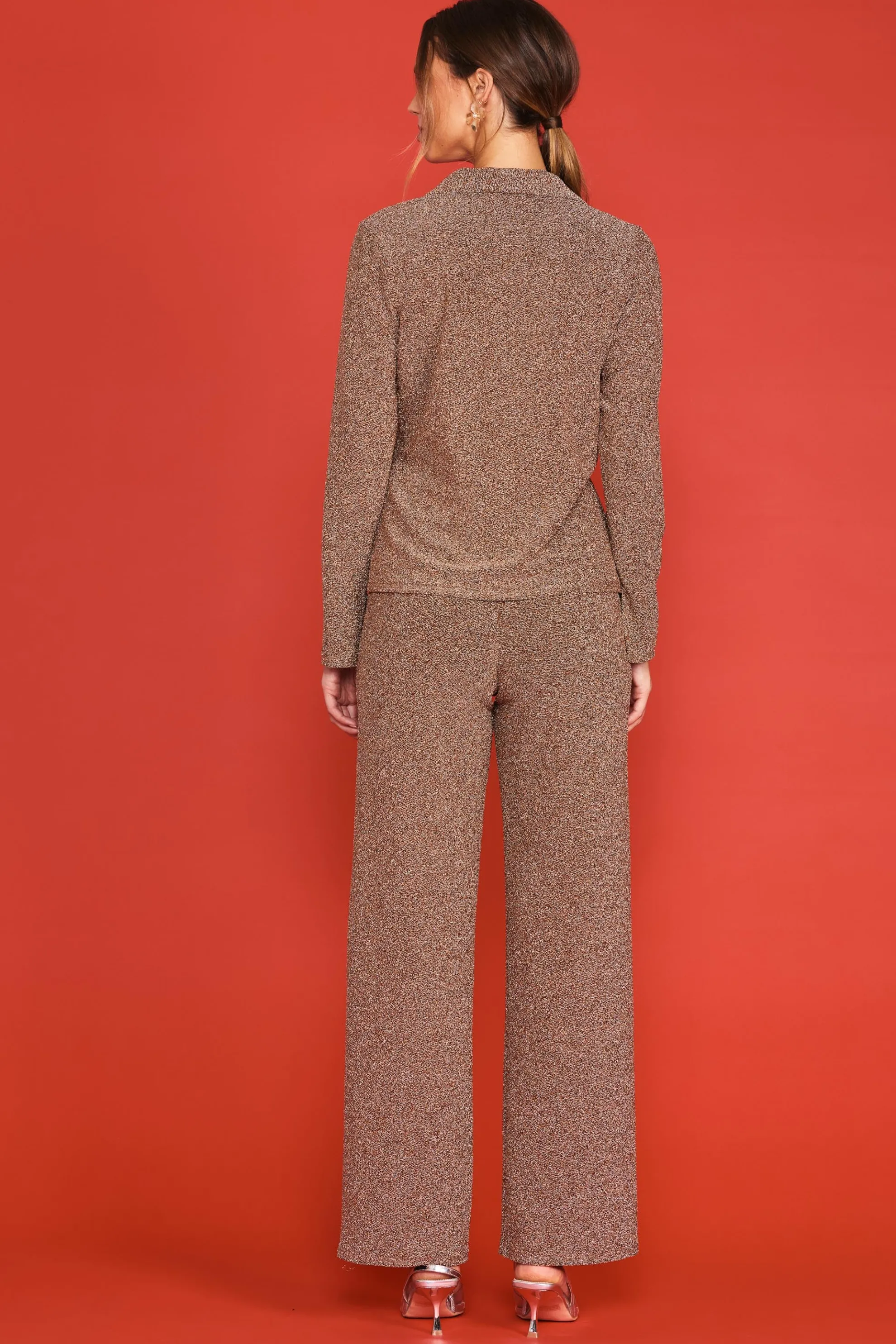 Glimmery rose-gold lurex infuses metallic shine into this knitted button-up shirt. The style exudes relaxed glamour in an easy shape accented by a V-shaped neckline, pointed collar, and long sleeves with slit openings. Wear it with our matching lurex trousers for a cool statement set.