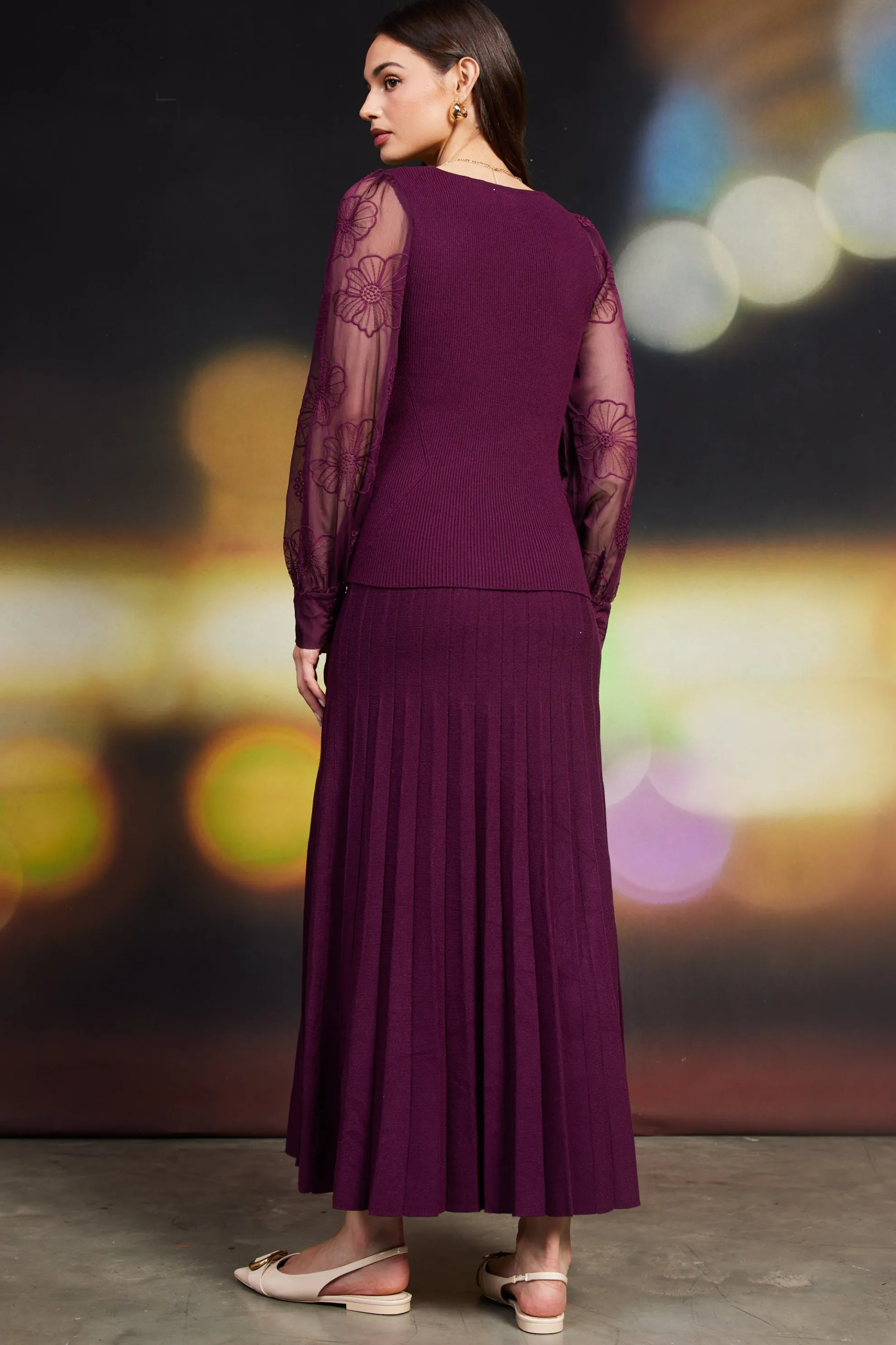 This surplice sweater top features a figure-hugging rib knit featuring a plunging V-neckline and a deep plum color. The sheer woven sleeves are embellished with charming floral embroidery, dainty eyelets, and buttoned cuffs.