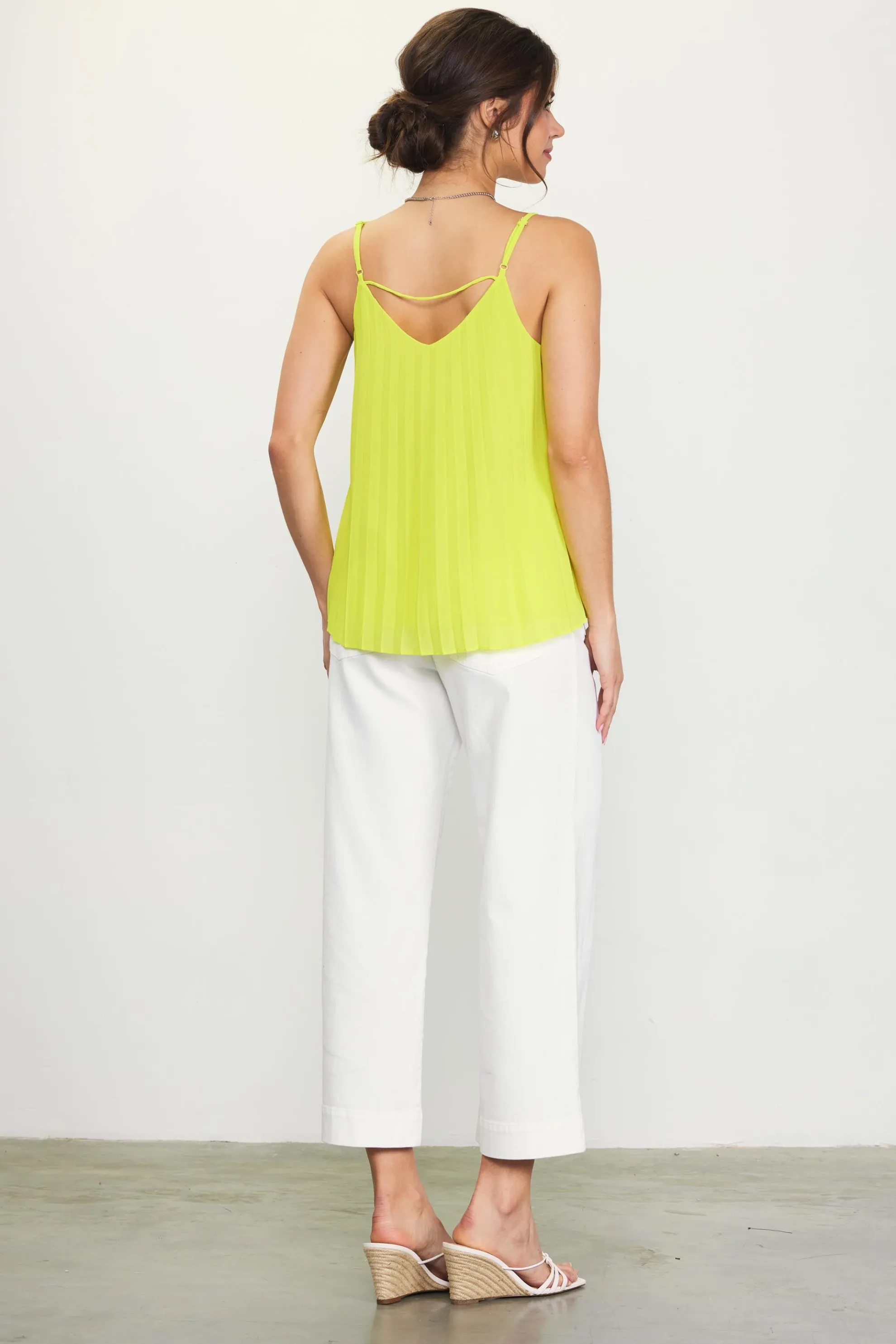 Vivid color and sharp pleats add excitement to the simple silhouette of this relaxed cami top. Slinky and lightweight, it’s got a slim strap that crosses the back.