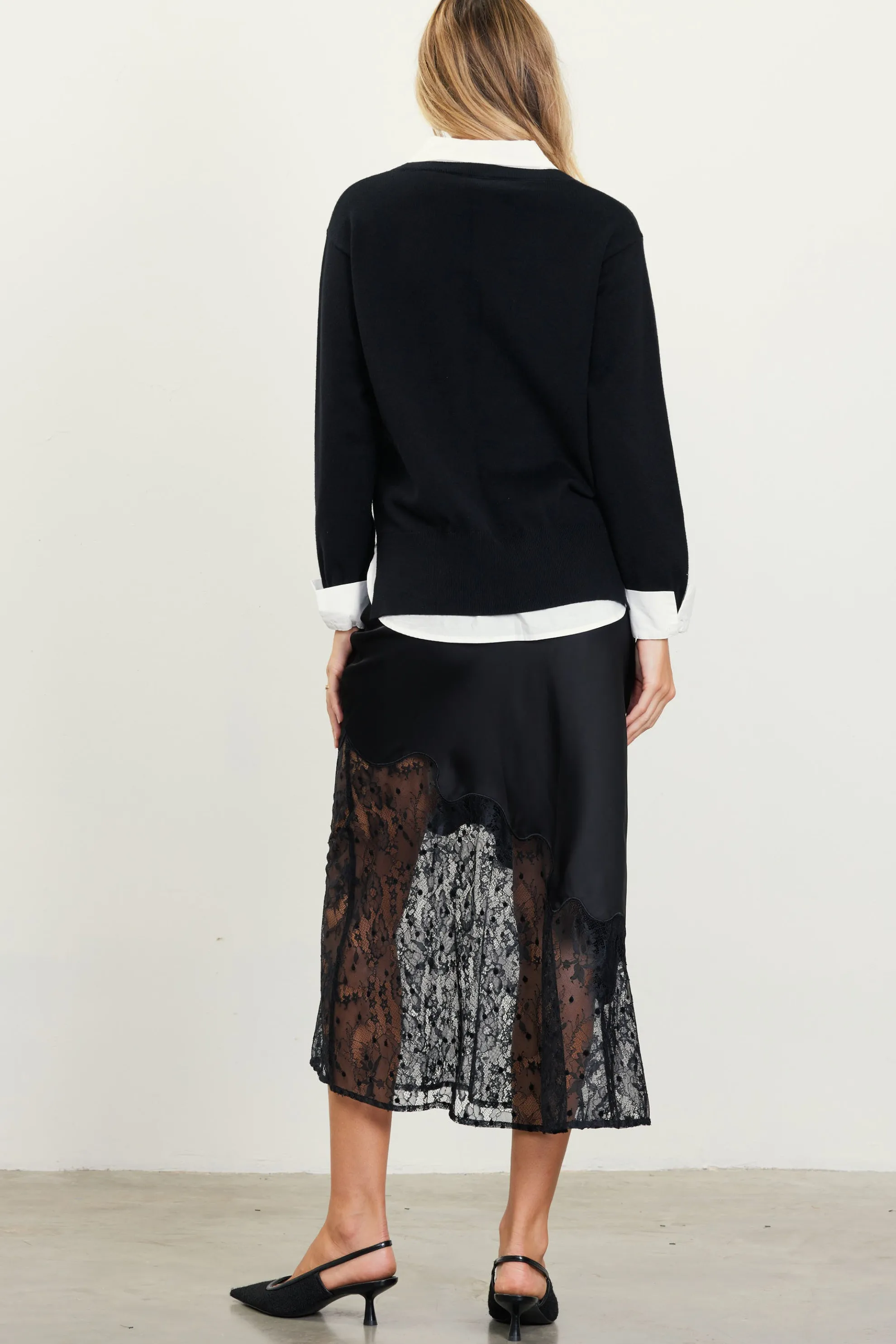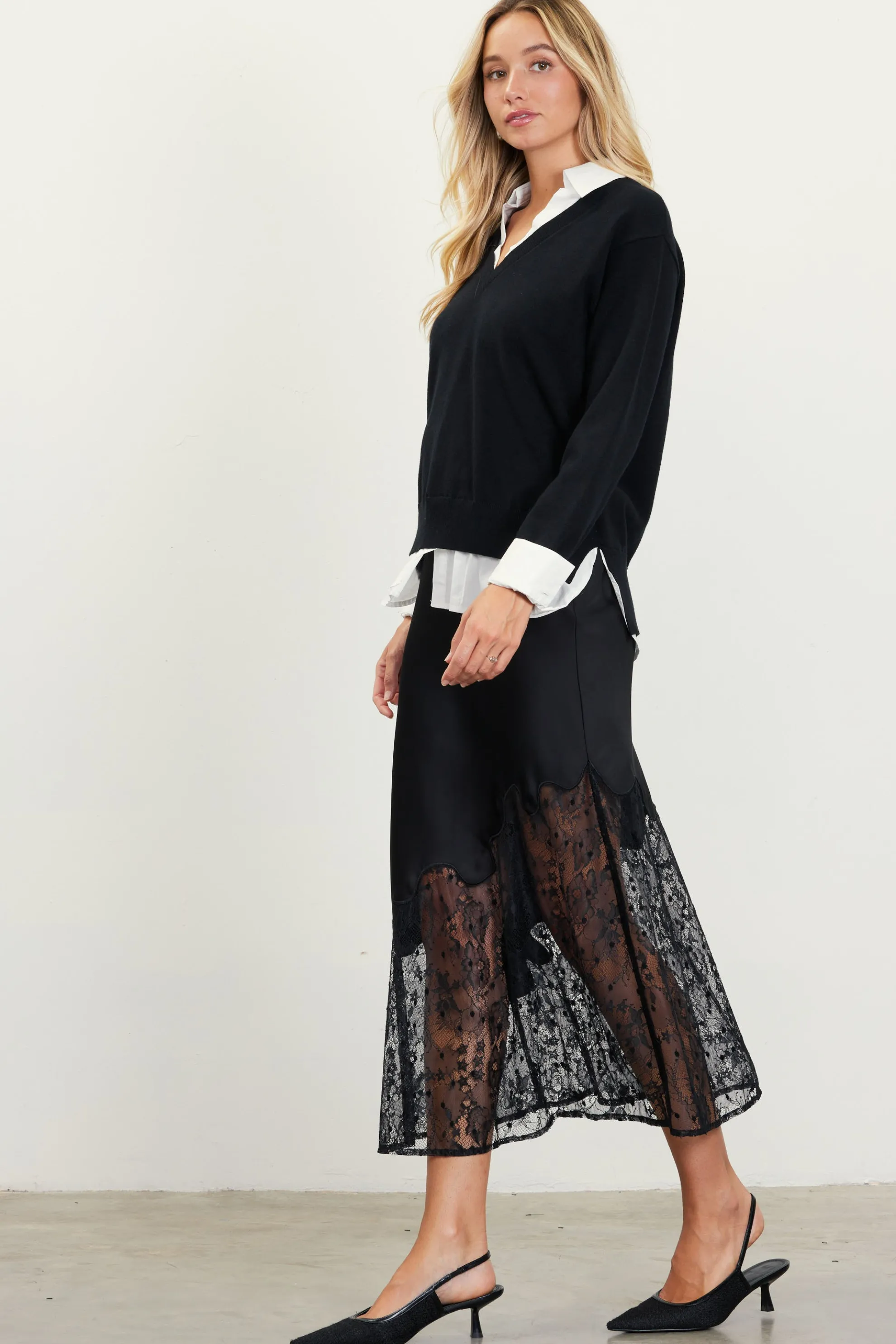 A layered look with zero effort. Contrasting textures come together on a long-sleeve V-neck sweater accented by woven shirting elements.