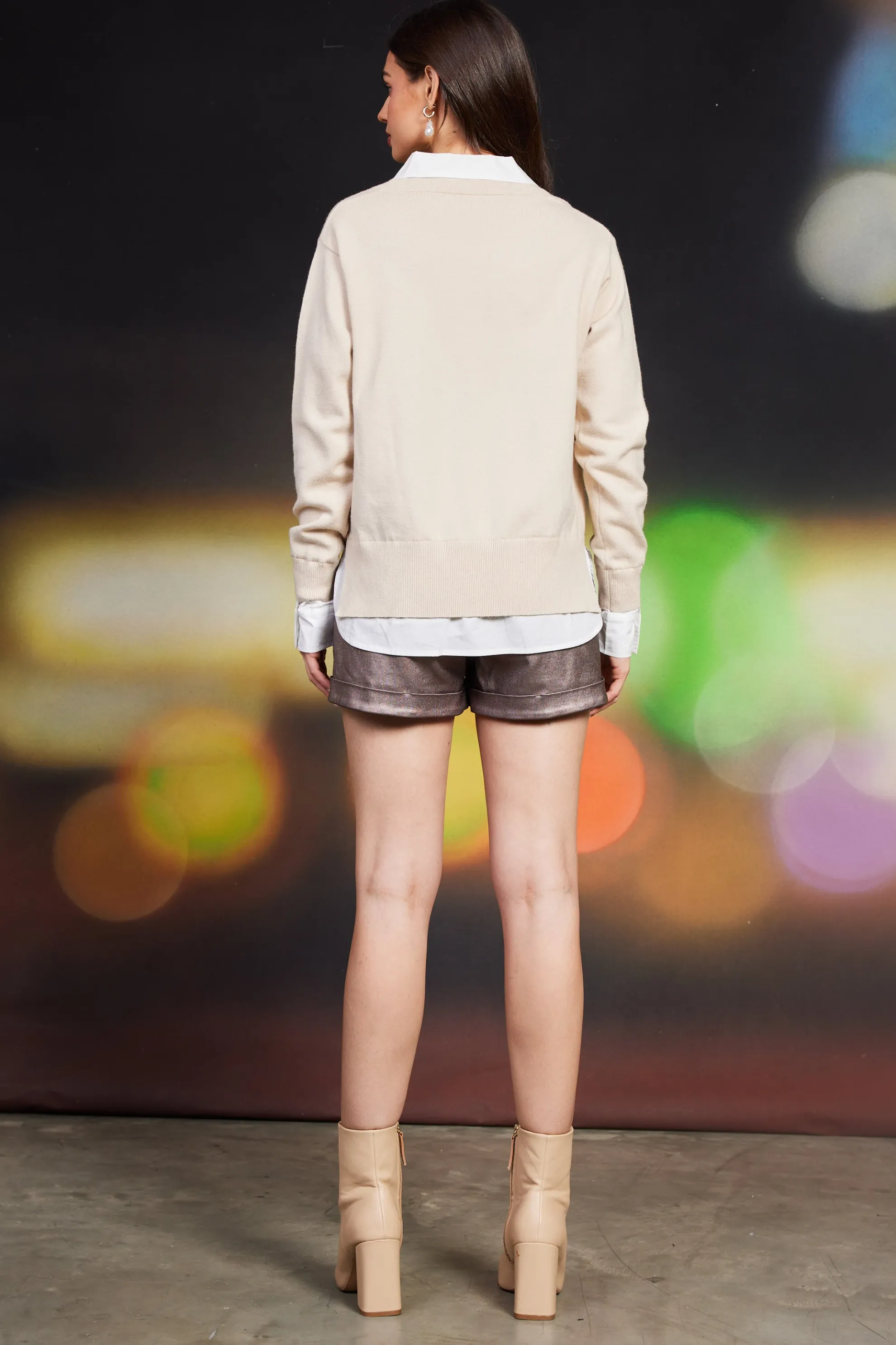 A layered look with zero effort. Contrasting textures come together on a long-sleeve V-neck sweater accented by woven shirting elements.