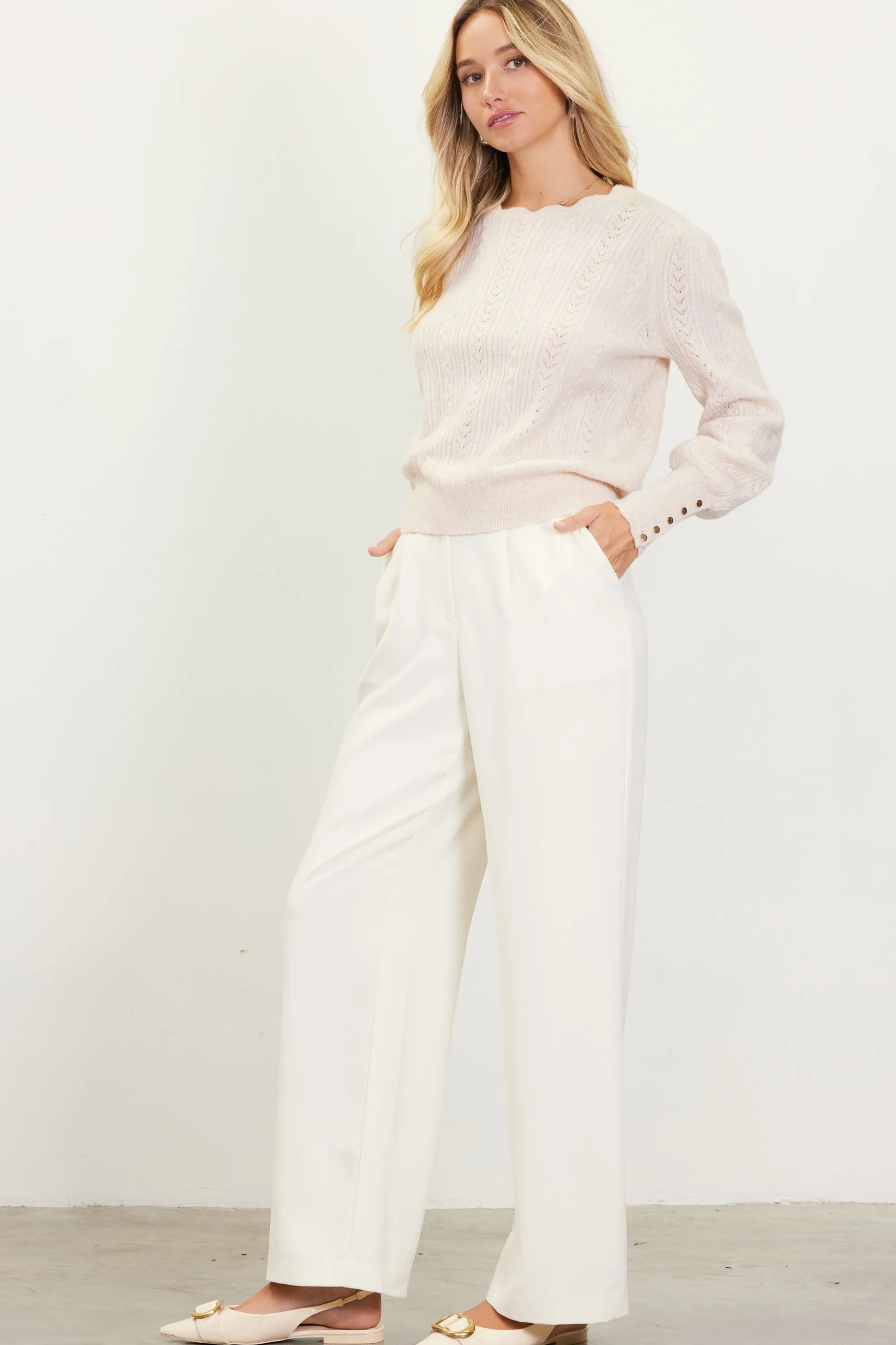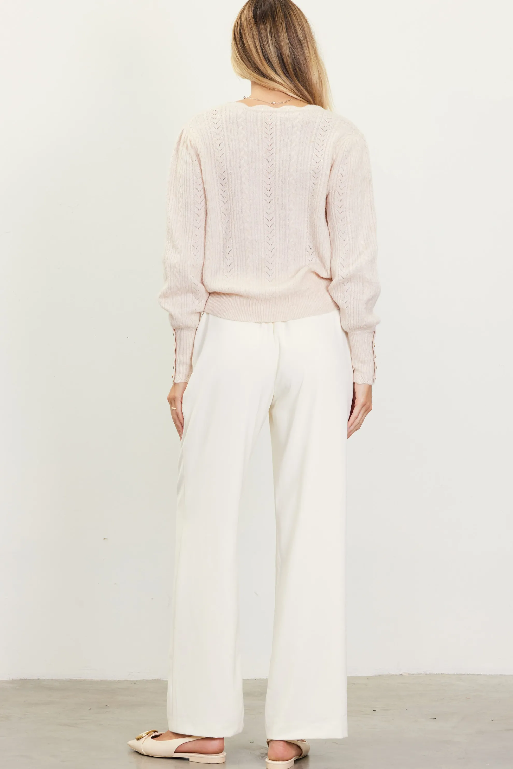 Knitted with a cabled design and pointelle stitches, this long-sleeve sweater has a round neckline featuring wavy scalloped edges. Decorative gold buttons detail the cuffs.