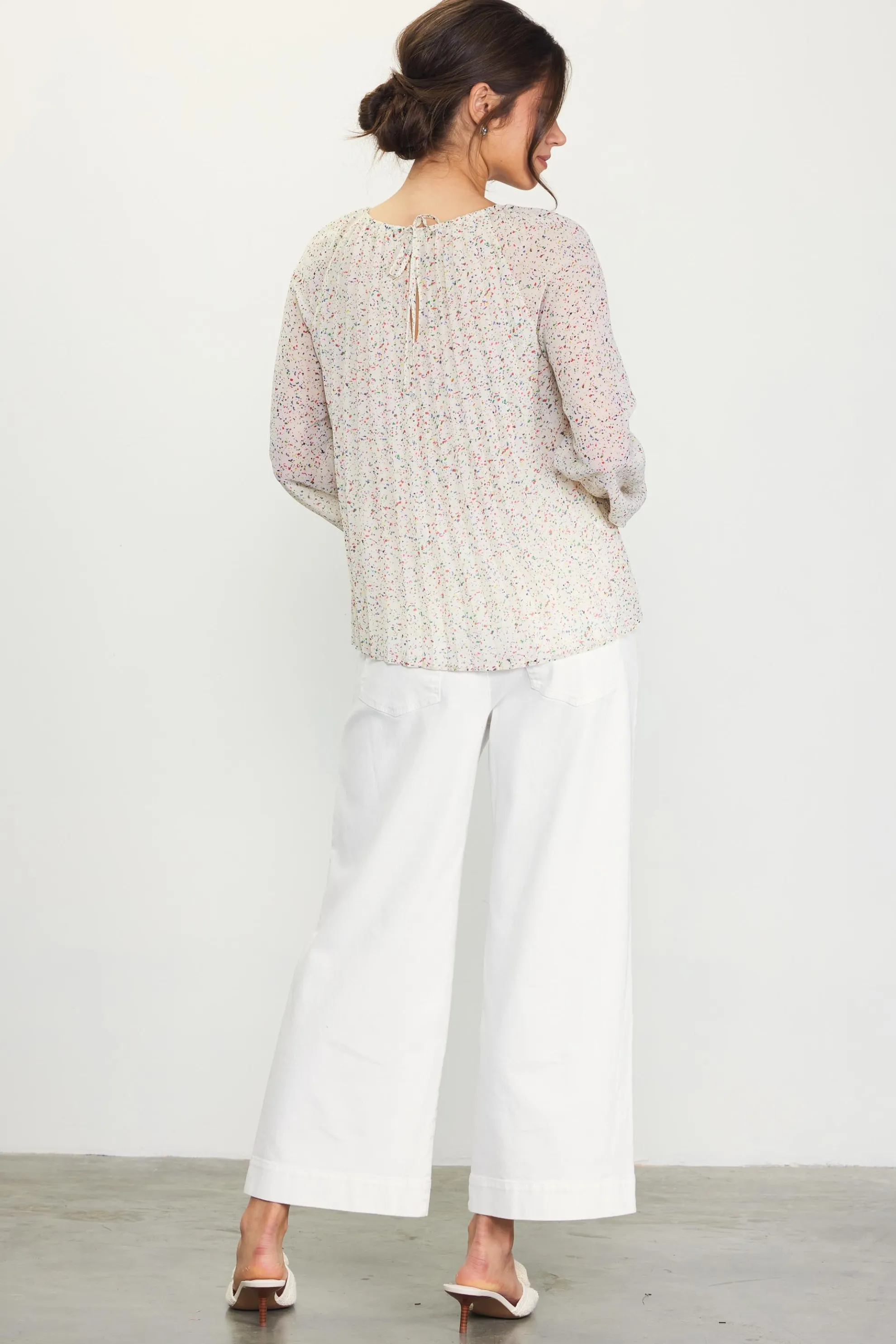 Done in a floaty silhouette, this cream-colored top showcases an inky, multicolored splatter print. There’s also those irresistible details: airy pleats, sliced cutouts, and an adjustable tunnel-tie neckline that loops into a little bow at the back. It’s pretty much perfection.