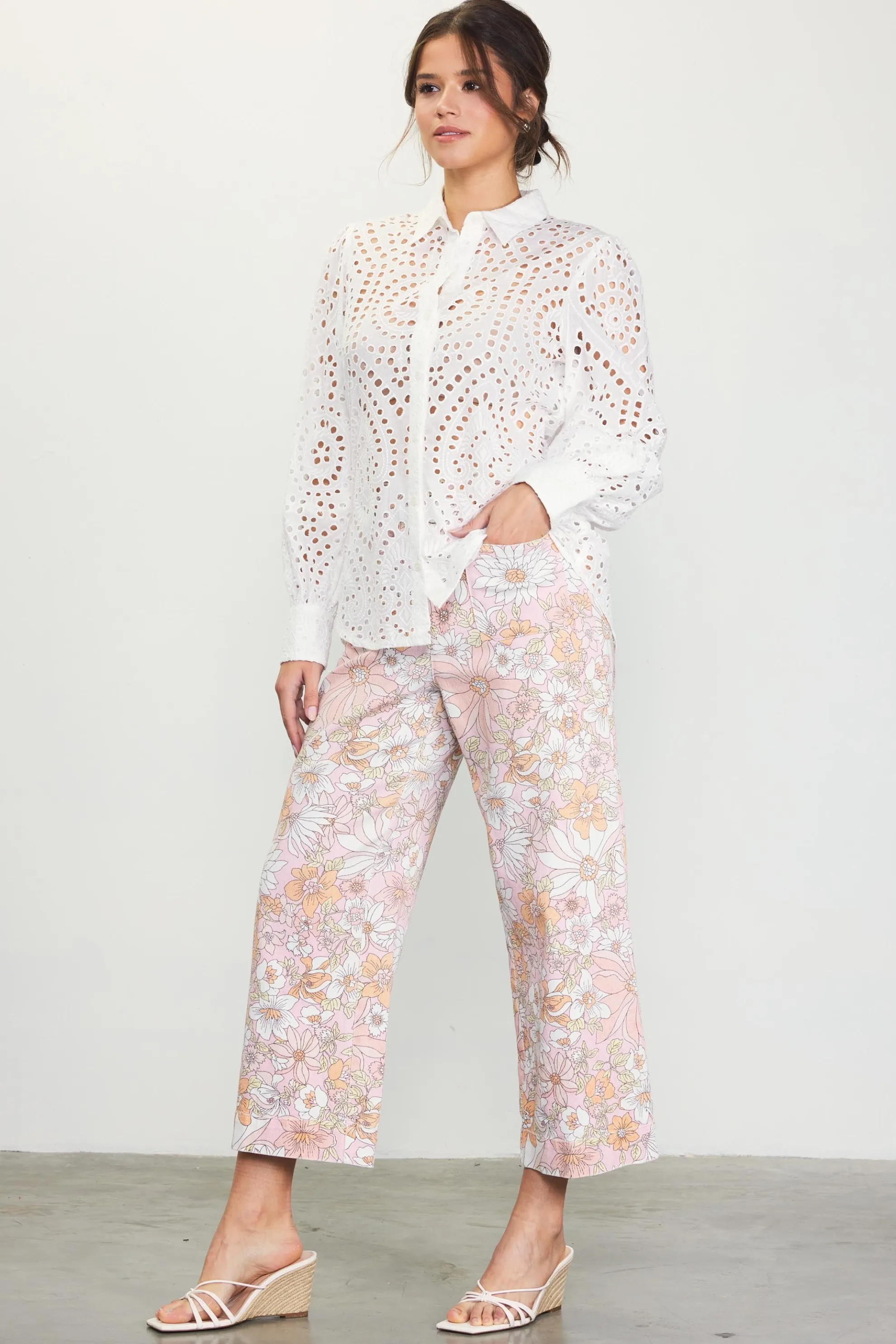 Embroidered eyelets create a peekaboo effect on this airy long-sleeve blouse. Button it up over a tonal cami or layer it on top of your swimwear while on holiday.