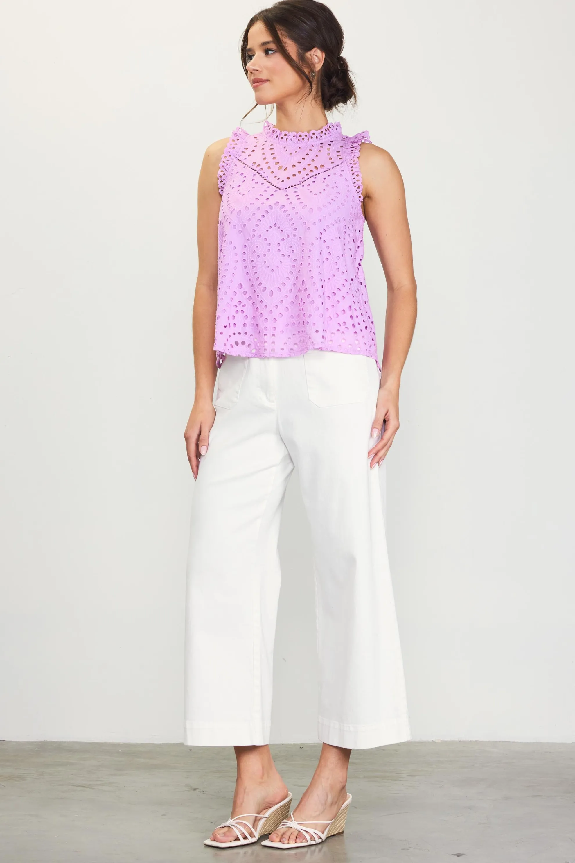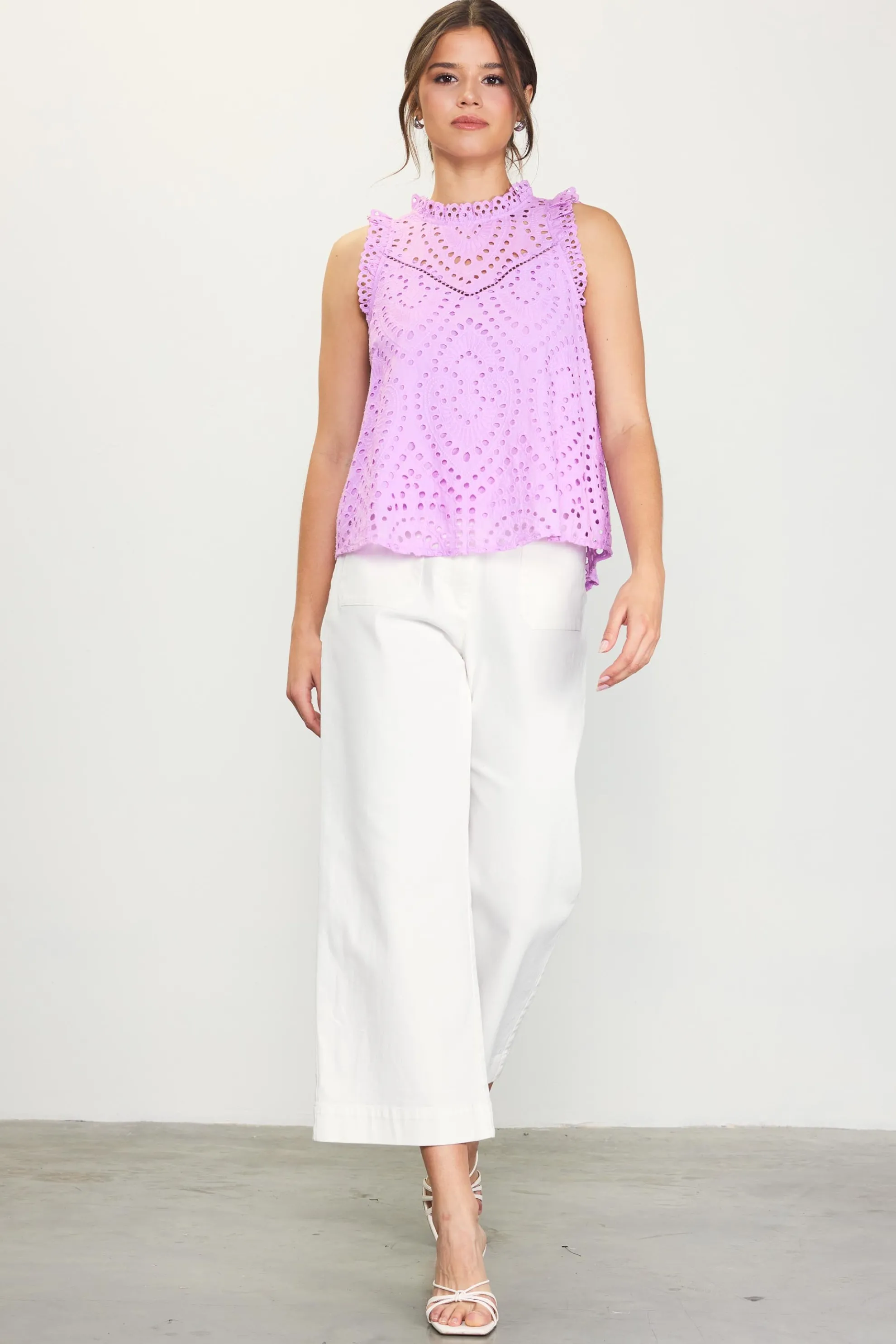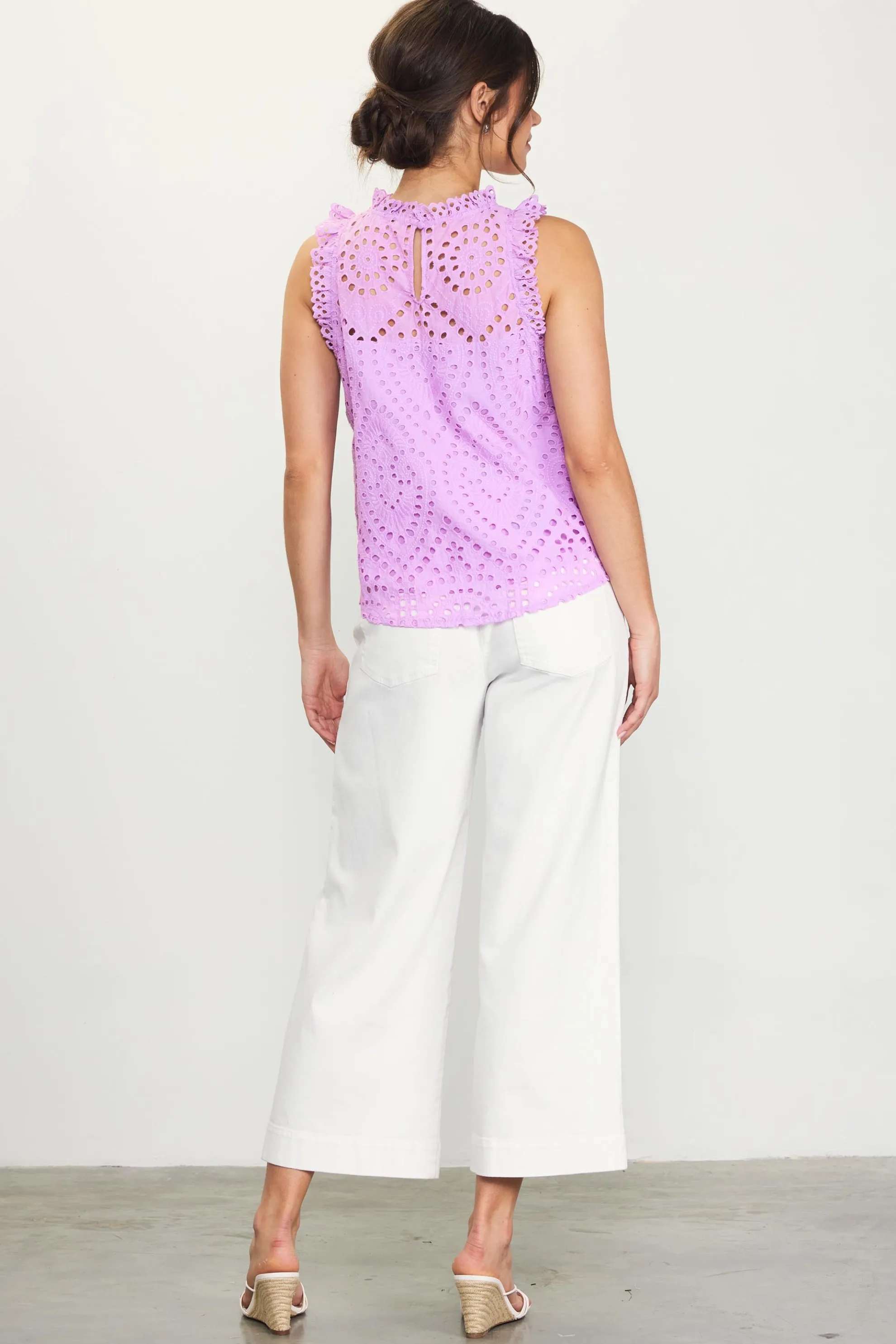 Eyelet lace, swingy shape, keyhole back—this top is unapologetically pretty. Ruffle trim adds an alluring finish.