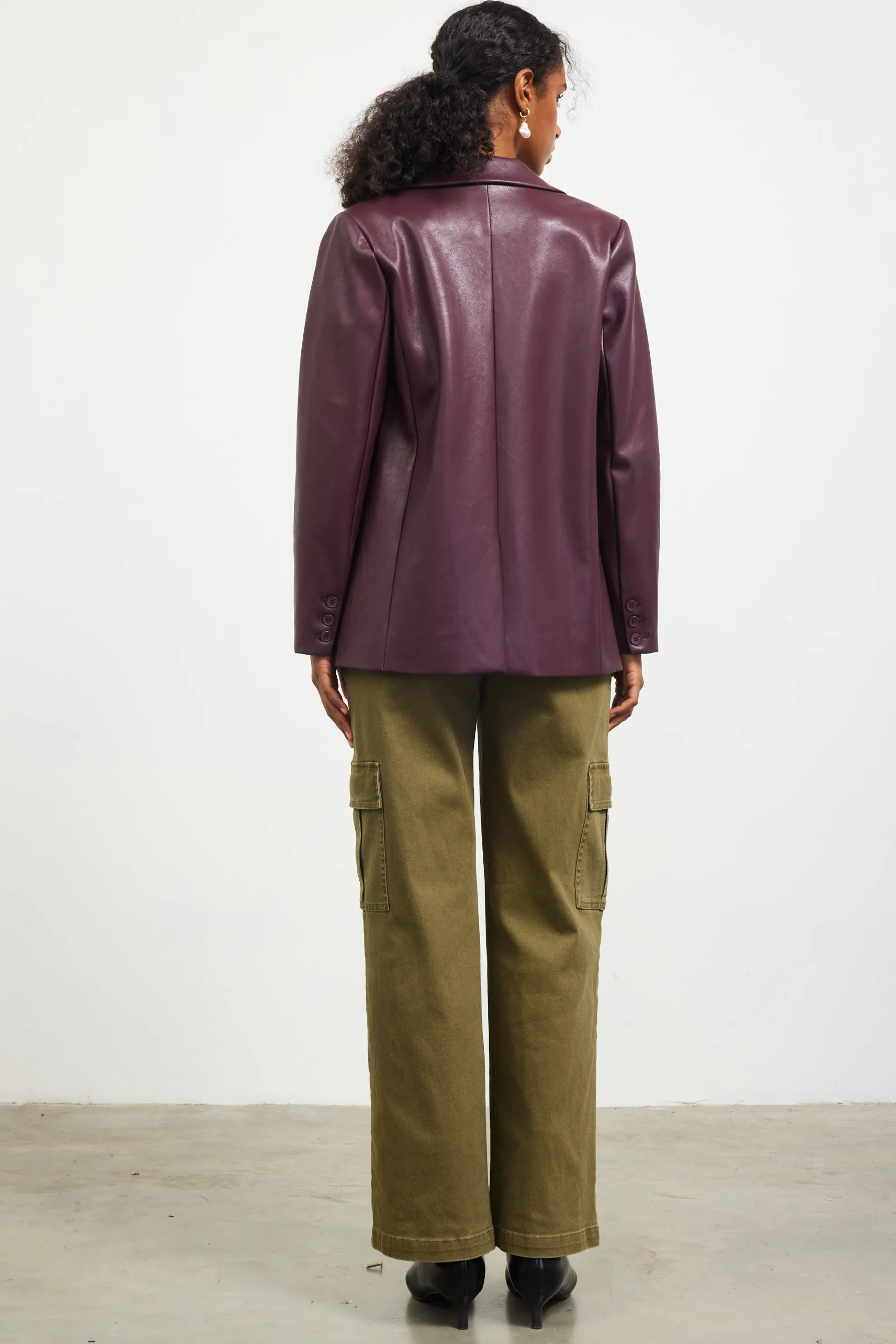 The staple single-breasted blazer, updated in smooth vegan leather for a modern edge. It’s cut for an oversized fit and features classic tailored details—notched lapels, welt pockets, and a vented back hem. Wear it slouchy and unbuttoned with denim or dress it up with a sleek skirt.