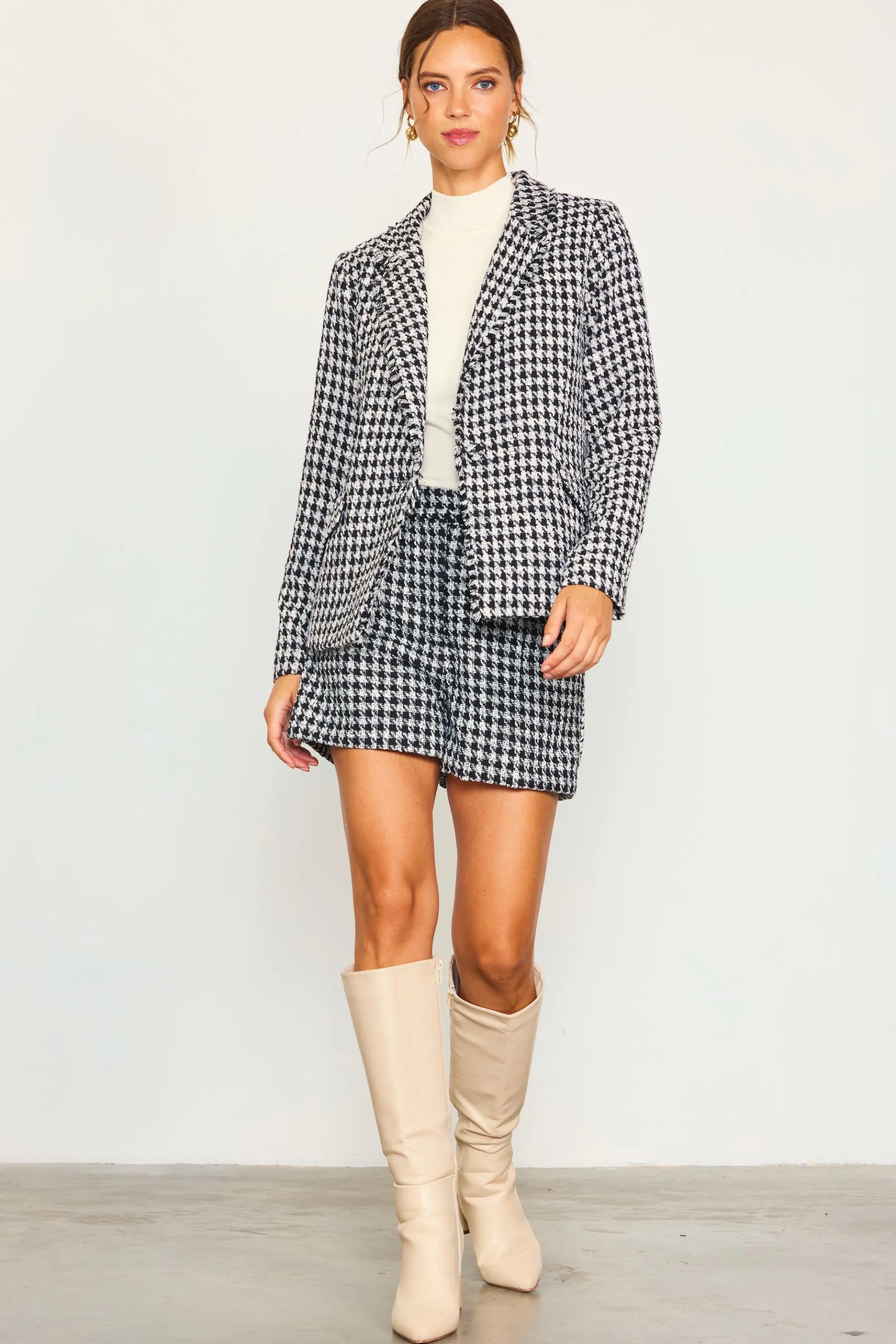 These shorts are tailored from a tweedy houndstooth fabric in black and cream. The pair sits high on the waist and has soft fringe at the hems.