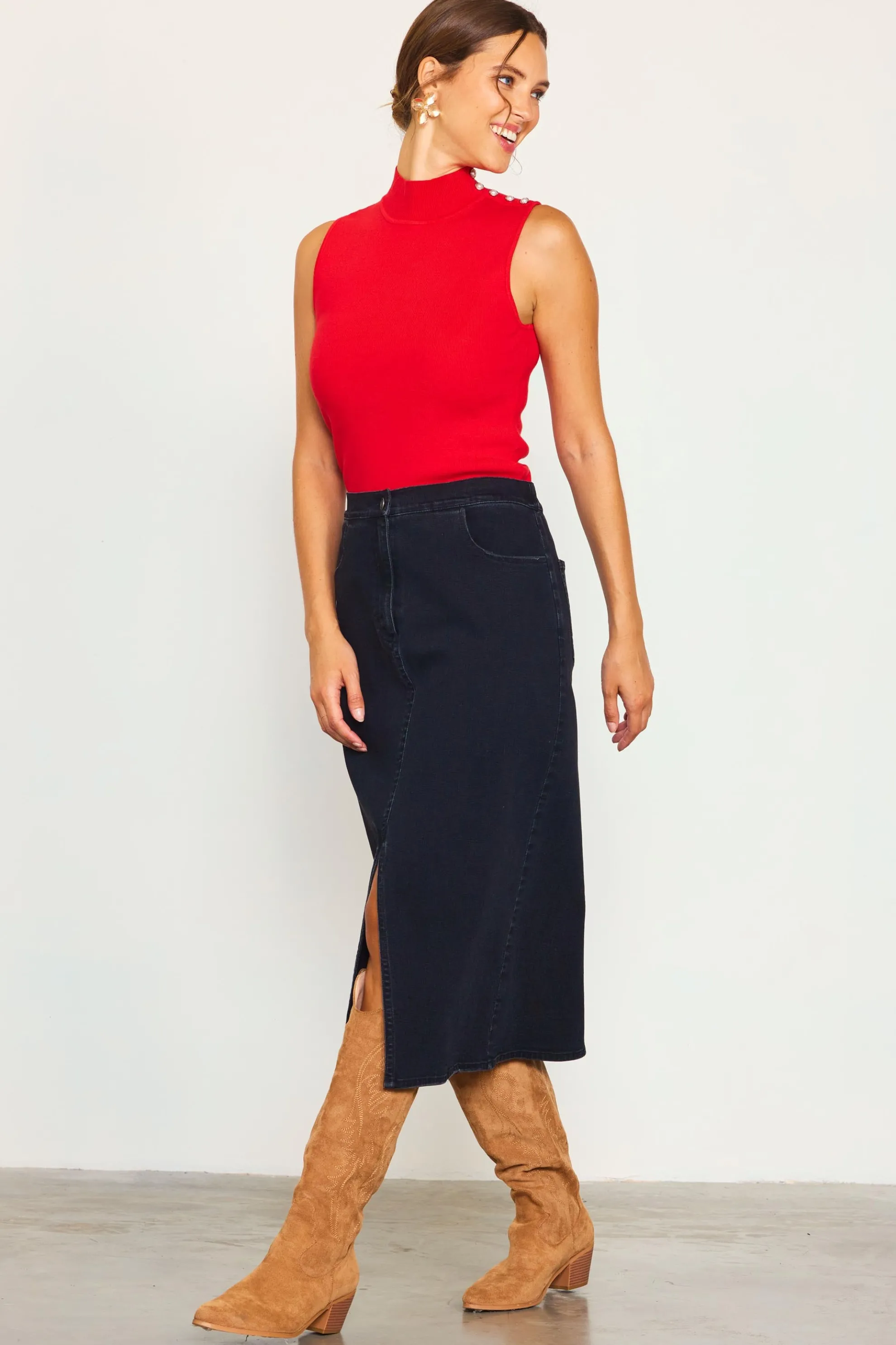 A black denim skirt is an easy piece to pair with tees, sweaters, or sleek knit tanks. This one is cut for a shin-skimming silhouette with a front slit, raw hem, and worn pocket edges. It’s elasticized at the back waist for an extra-comfortable fit.