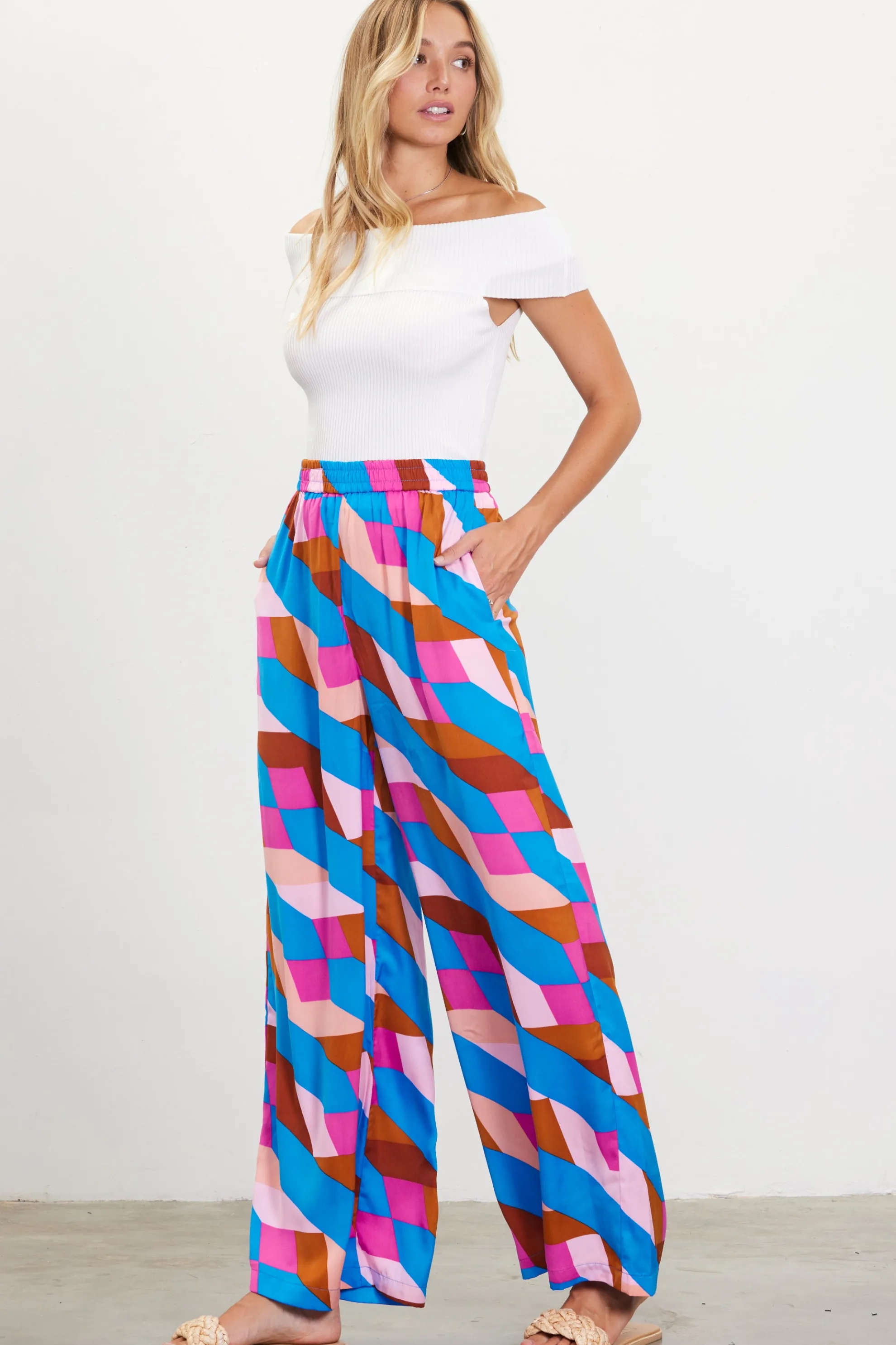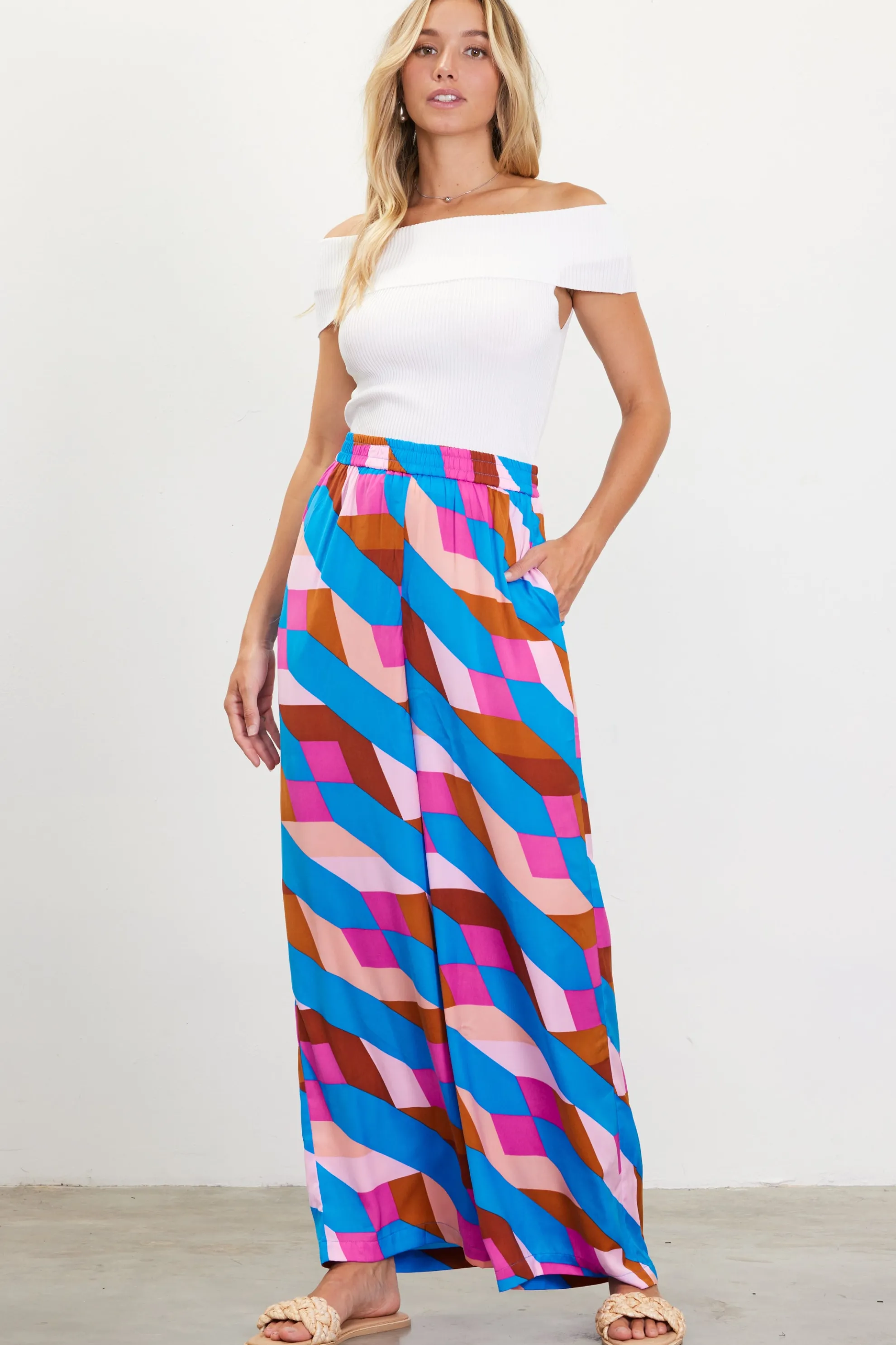 Brighten up with a pair of wide-leg pants in an eye-catching geometric print. Topped by a elasticized waist, this high-rise style has the ease you want to feel this season.