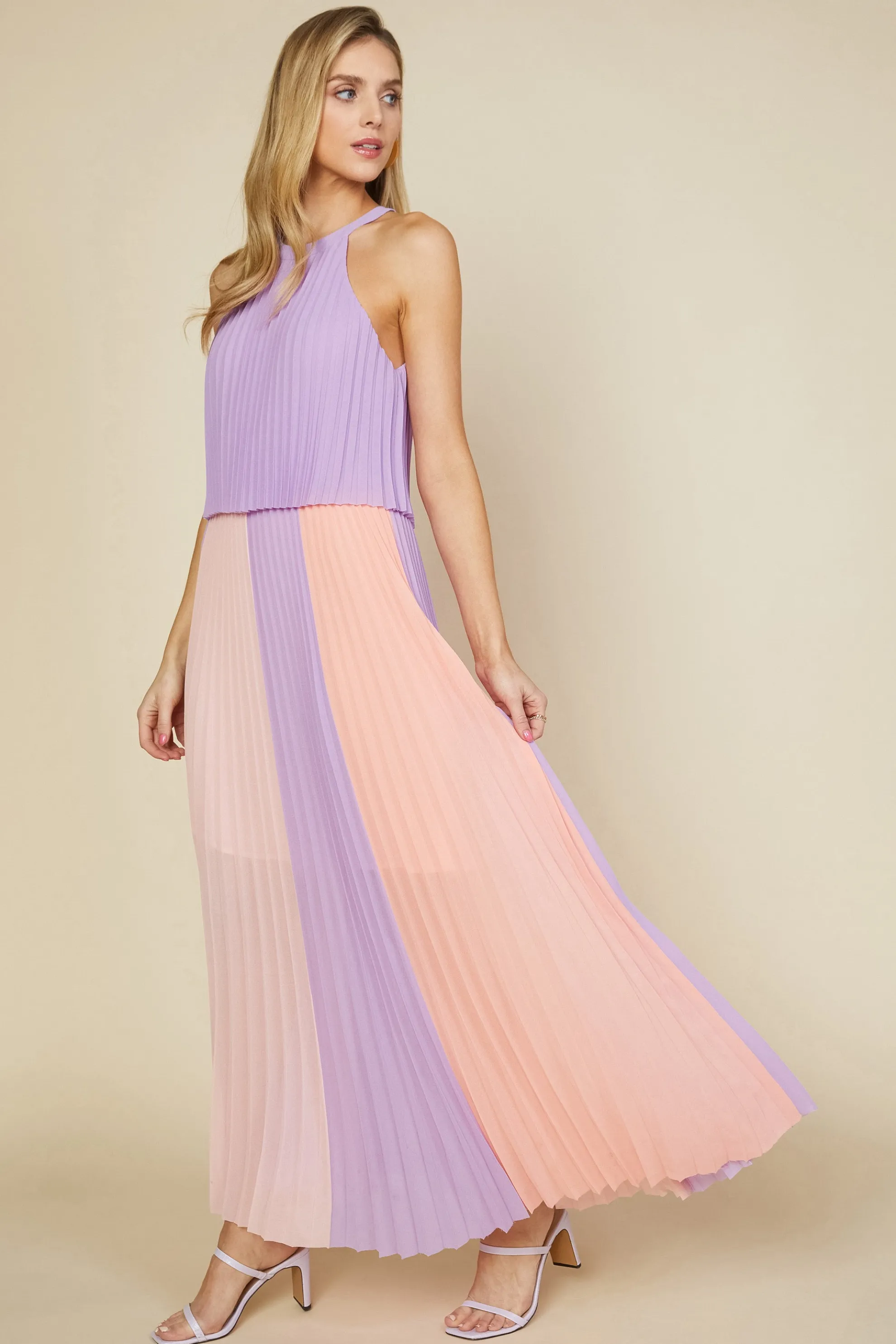 This halter maxi dress floats in the air with all those breezy pleats. It’s got a fluttery lavender-hued overlay at the bodice before falling to a cascading skirt color blocked in wide stripes of coral, lavender, and ballet pink. Finished with raw hems and a keyhole at the back, the style is absolutely stunning in motion.