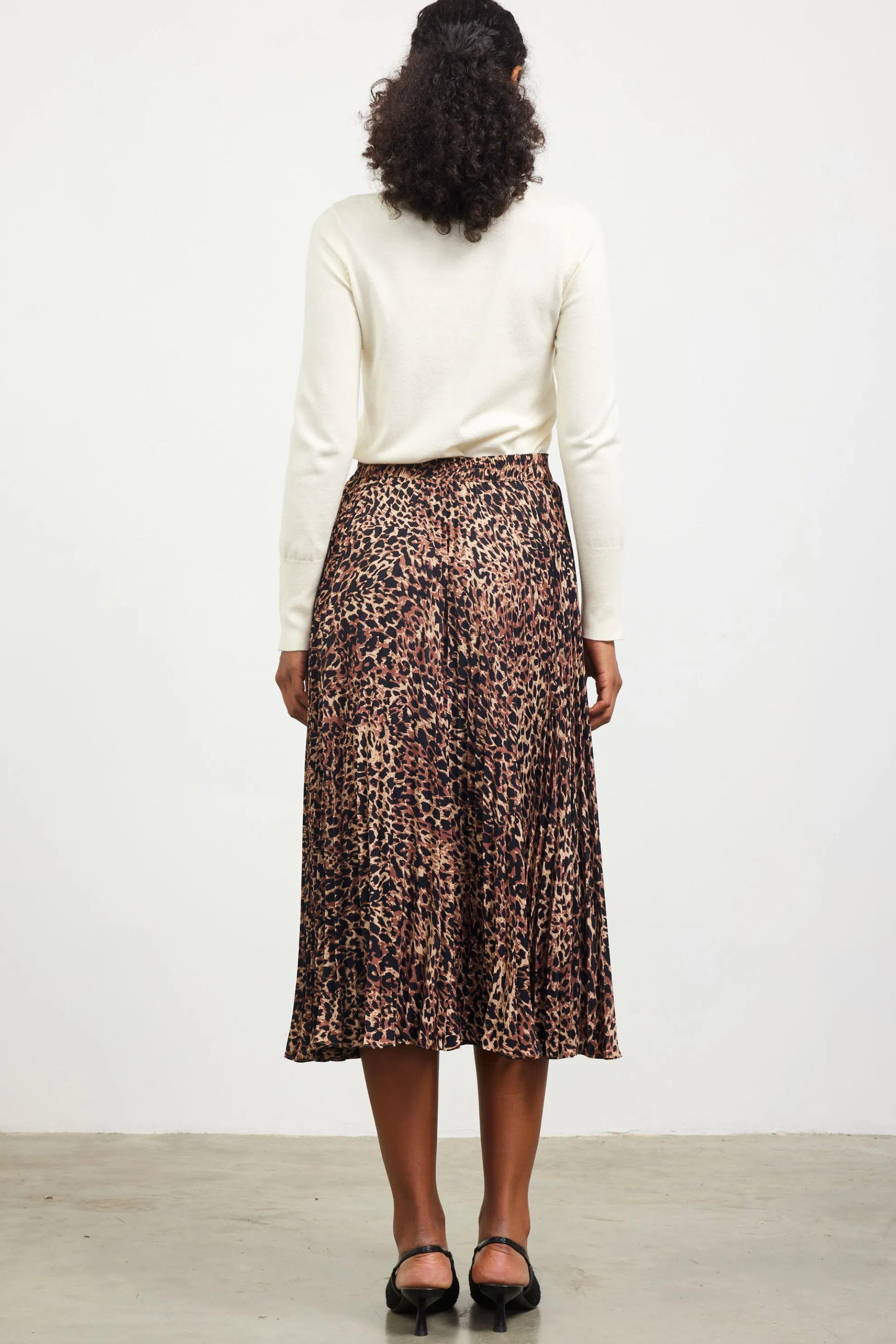This shin-length midi skirt is printed with leopard spots and pleated in all the right places. Accented by a tie at the waist, it’s elasticized at the back and falls to a flowy hem.