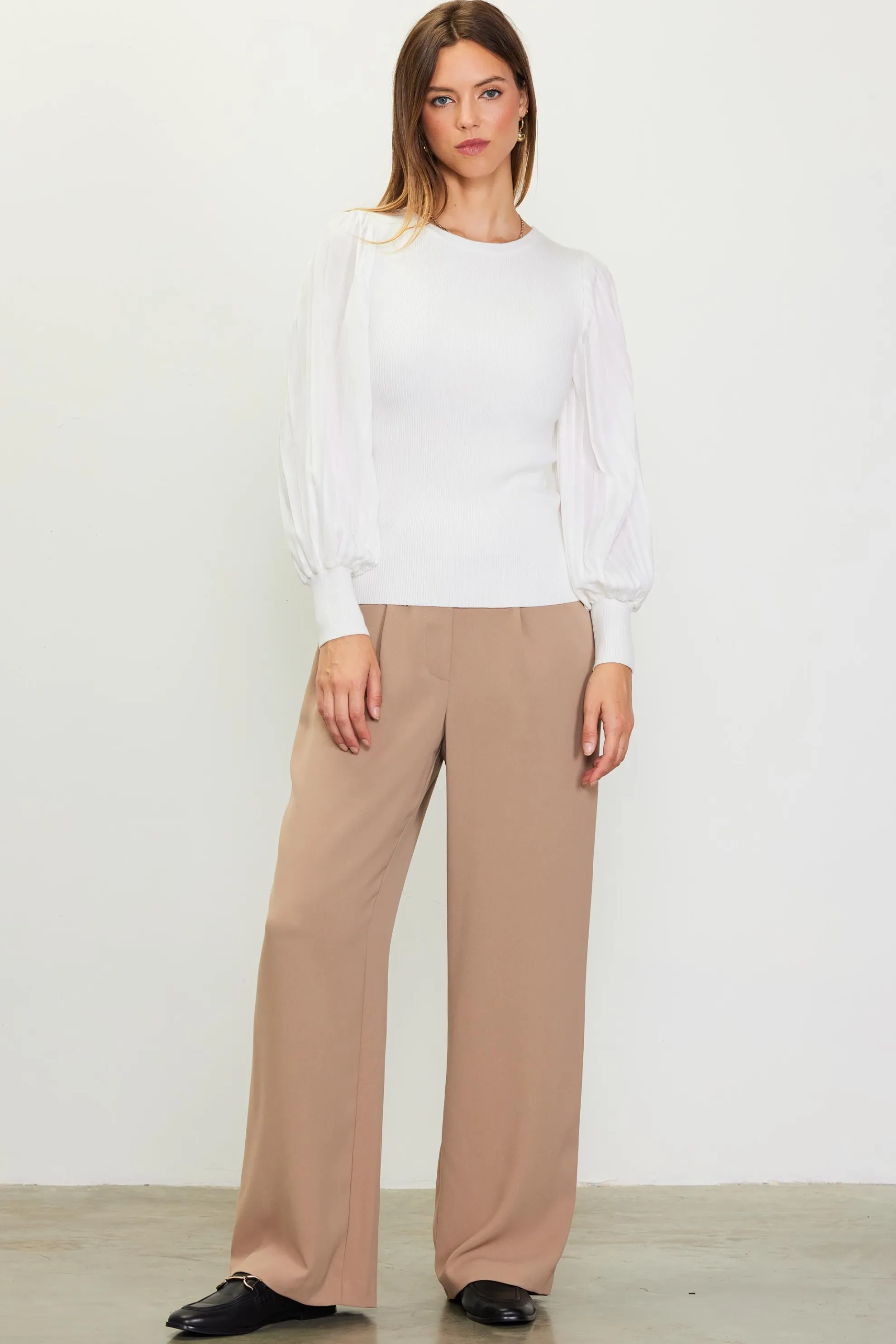Made from a figure-hugging rib knit, this top has a round neckline and long, pleated sleeves in a lightweight woven fabric. Knit cuffs draw in the shape.