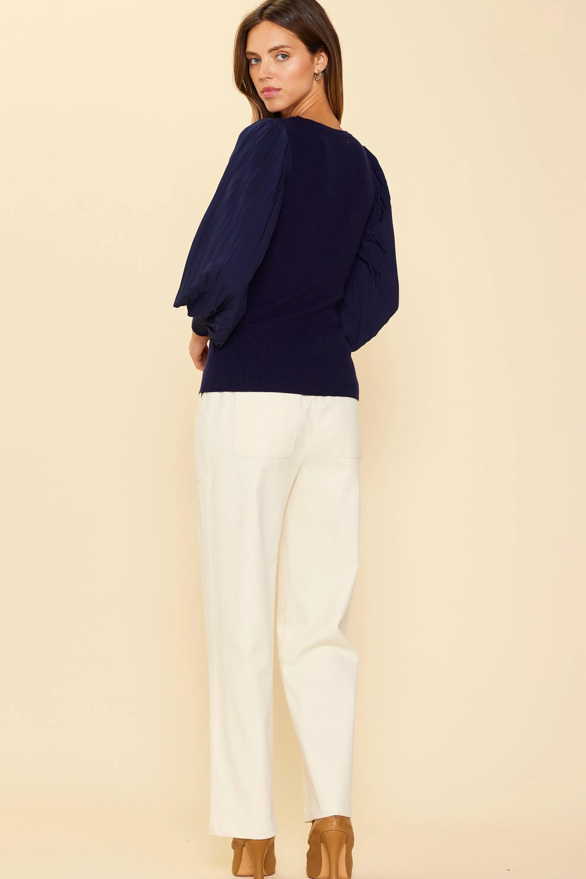 Made from a figure-hugging rib knit, this top has a round neckline and long, pleated sleeves in a lightweight woven fabric. Knit cuffs draw in the shape.