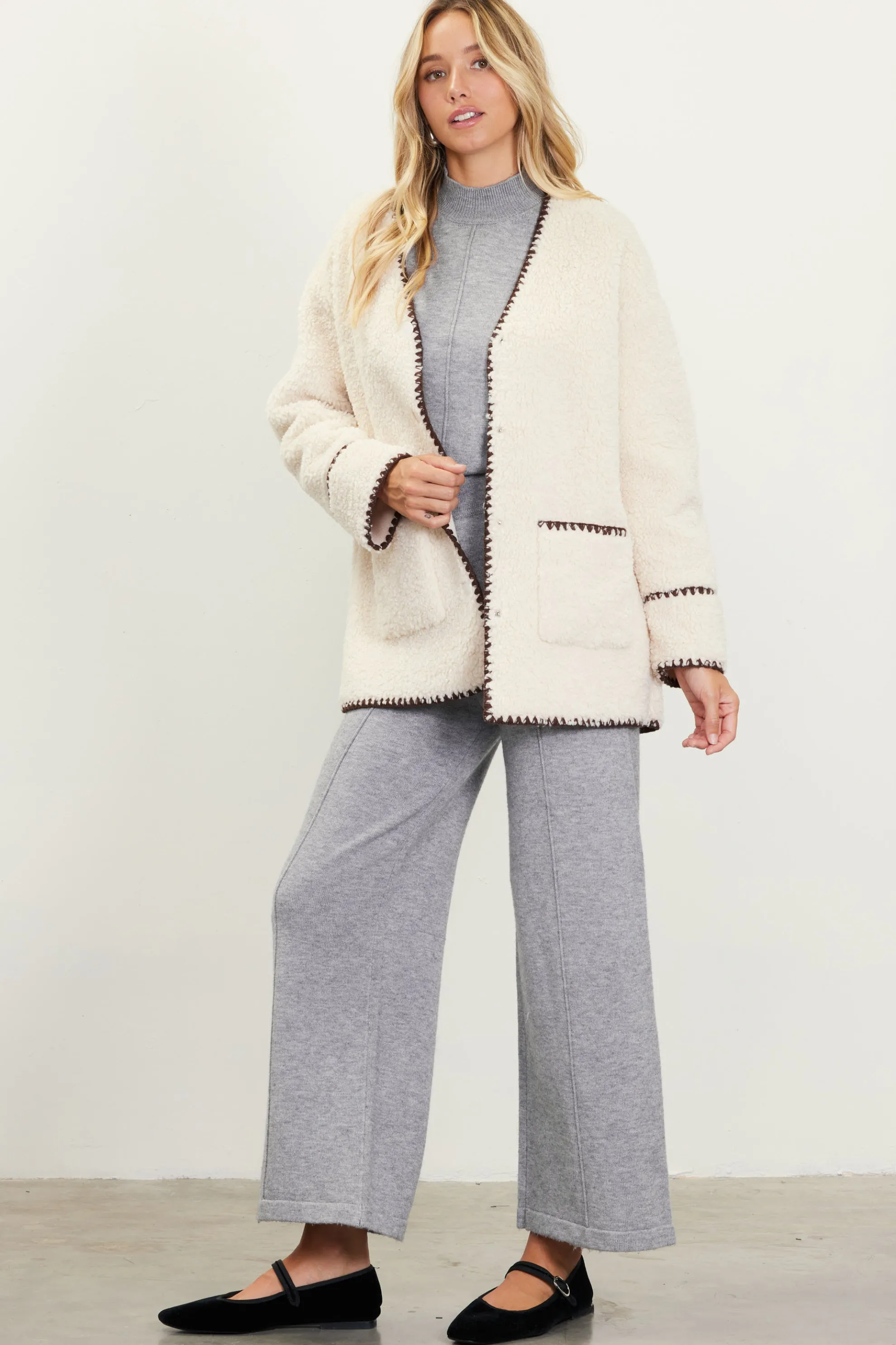 Wrap yourself in the clean lines and cozy comfort of this sherpa coat. Contrasted by blanket stitch detailing along the edges, it’s got a simple knee-length silhouette with a deep V-neckline, long sleeves, and a single patch pocket at one hip. Belt the waist to finish the look.
