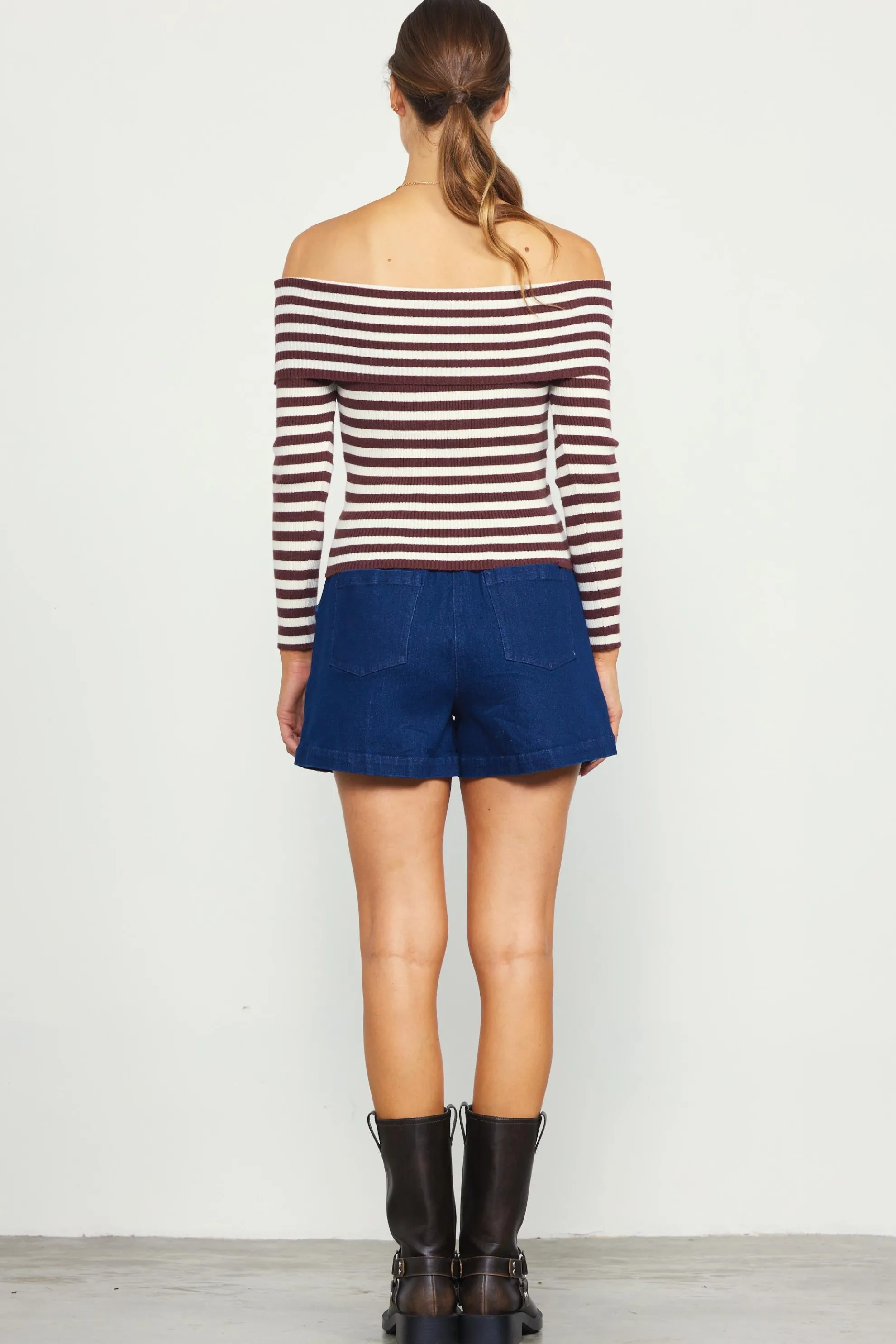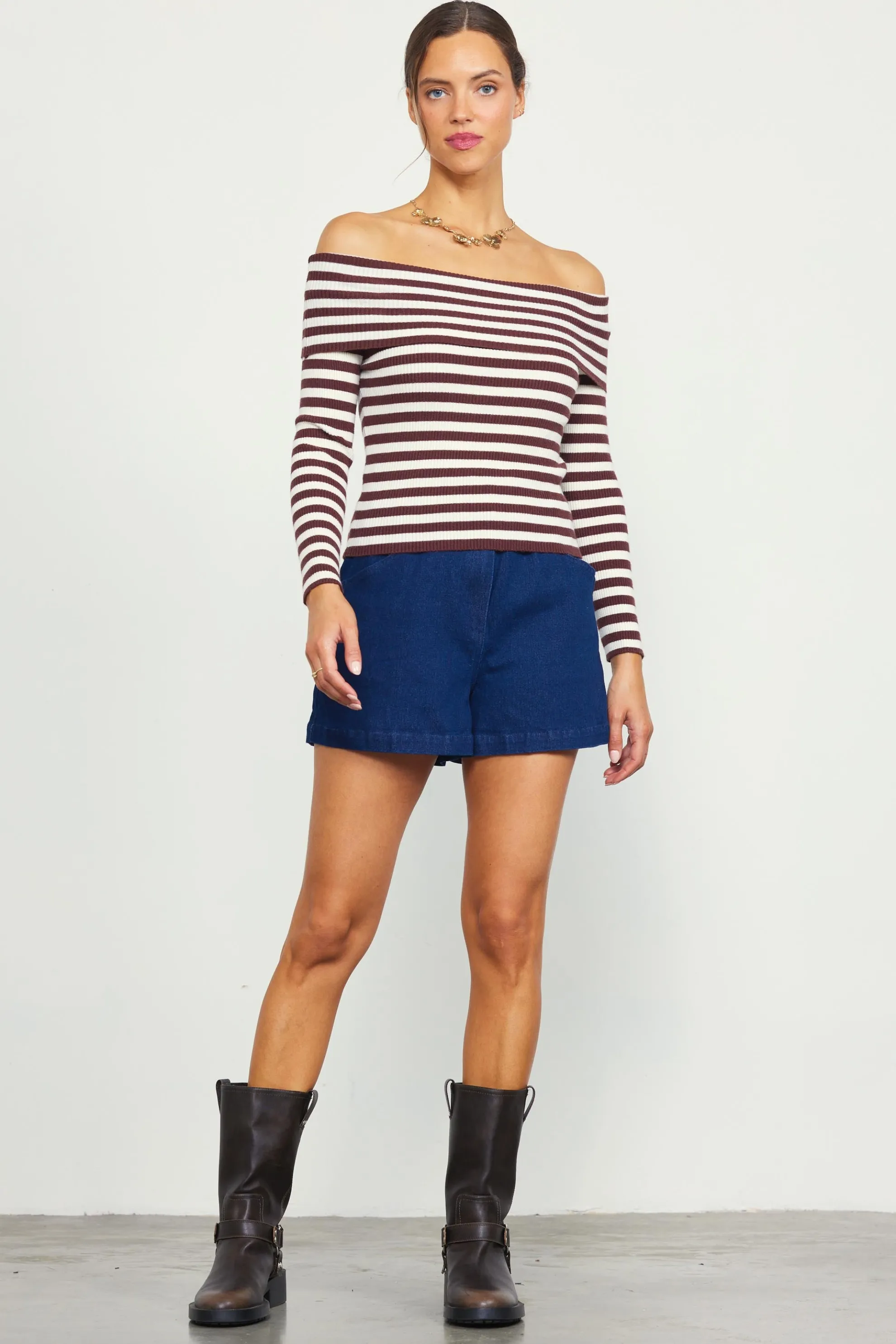 Crafted from a clingy rib knit, this off-shoulder top has a close, comfortable fit with long sleeves. Stripes lend a classic element to the fitted style.