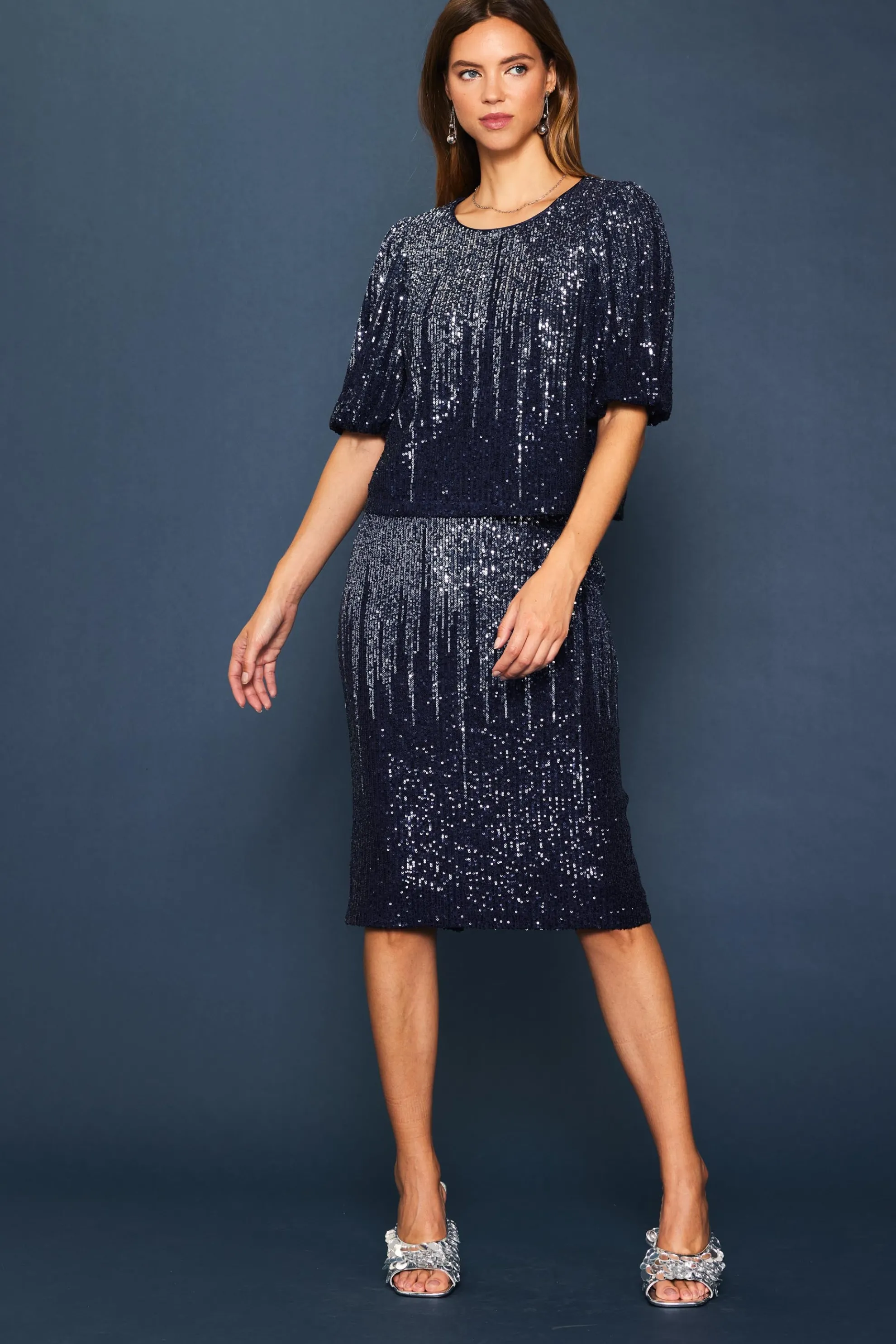 Thousands of little sequins in an ombré pattern twinkle on this figure-tracing pencil skirt. Finished with a slit at the back, it’s a no-brainer for nights out.