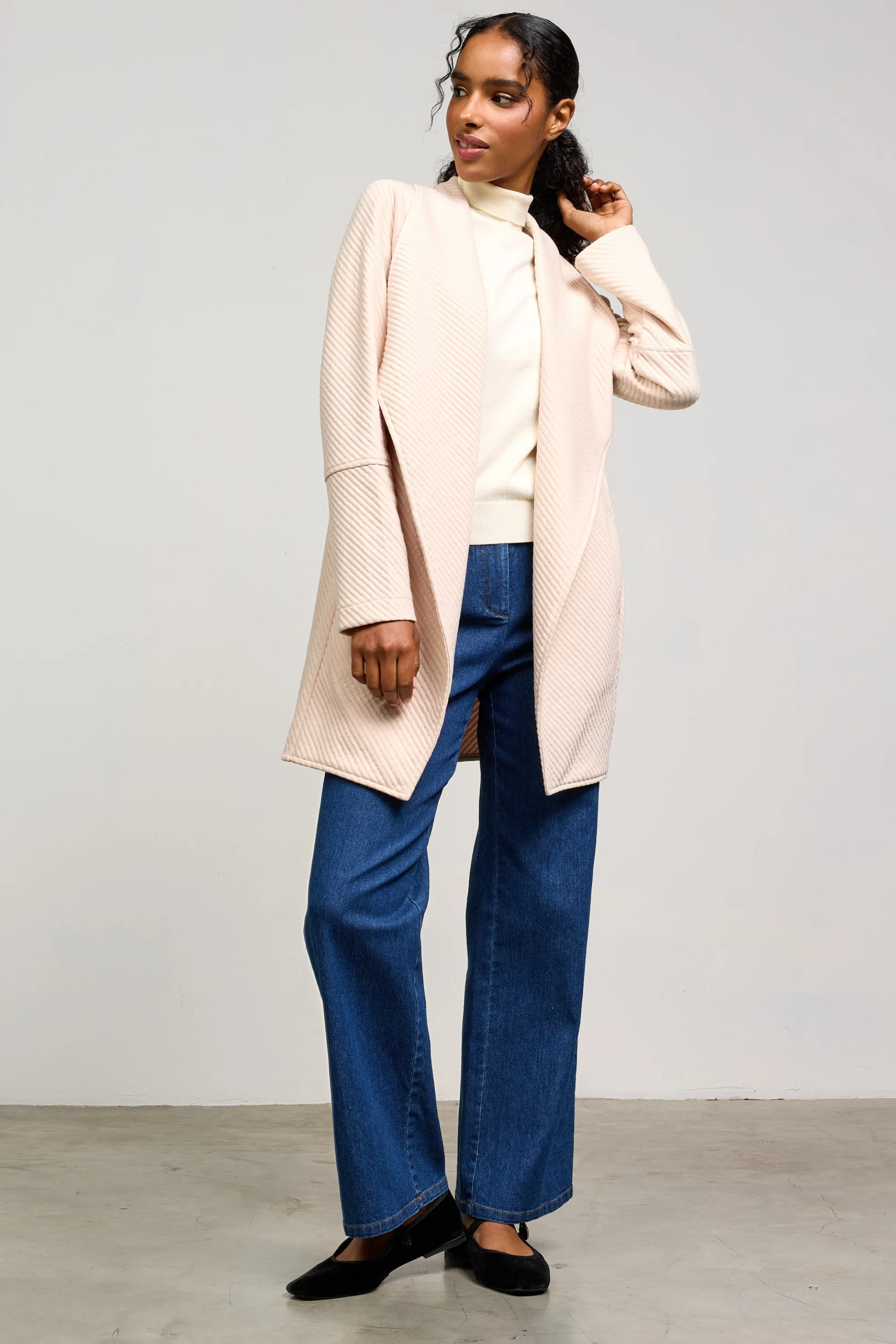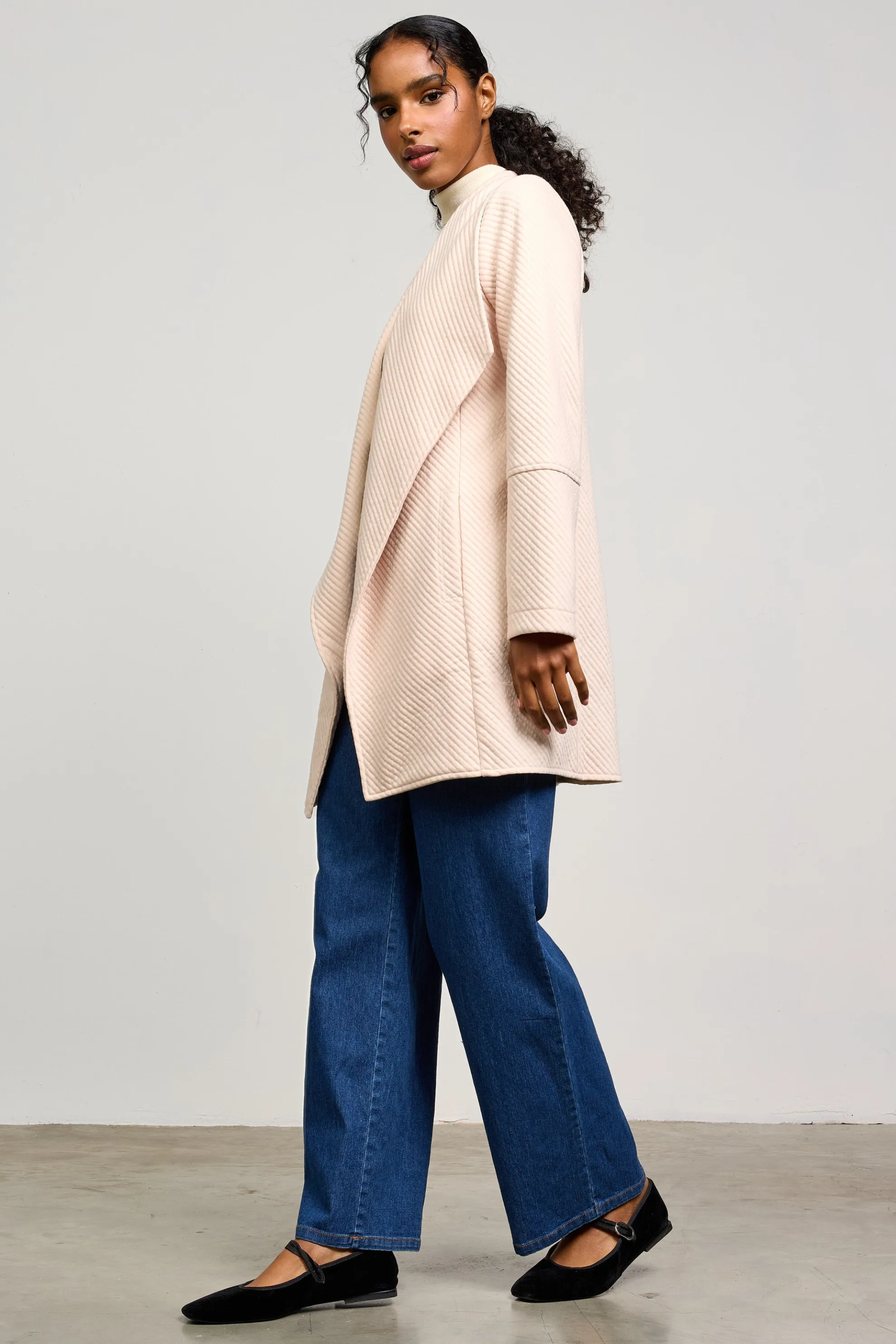 Throw on this open-front cardigan at the slightest hint of chill. Made from a quilted knit, it’s got longer lines, paneled sleeves, and an exaggerated collar for a modern statement.
