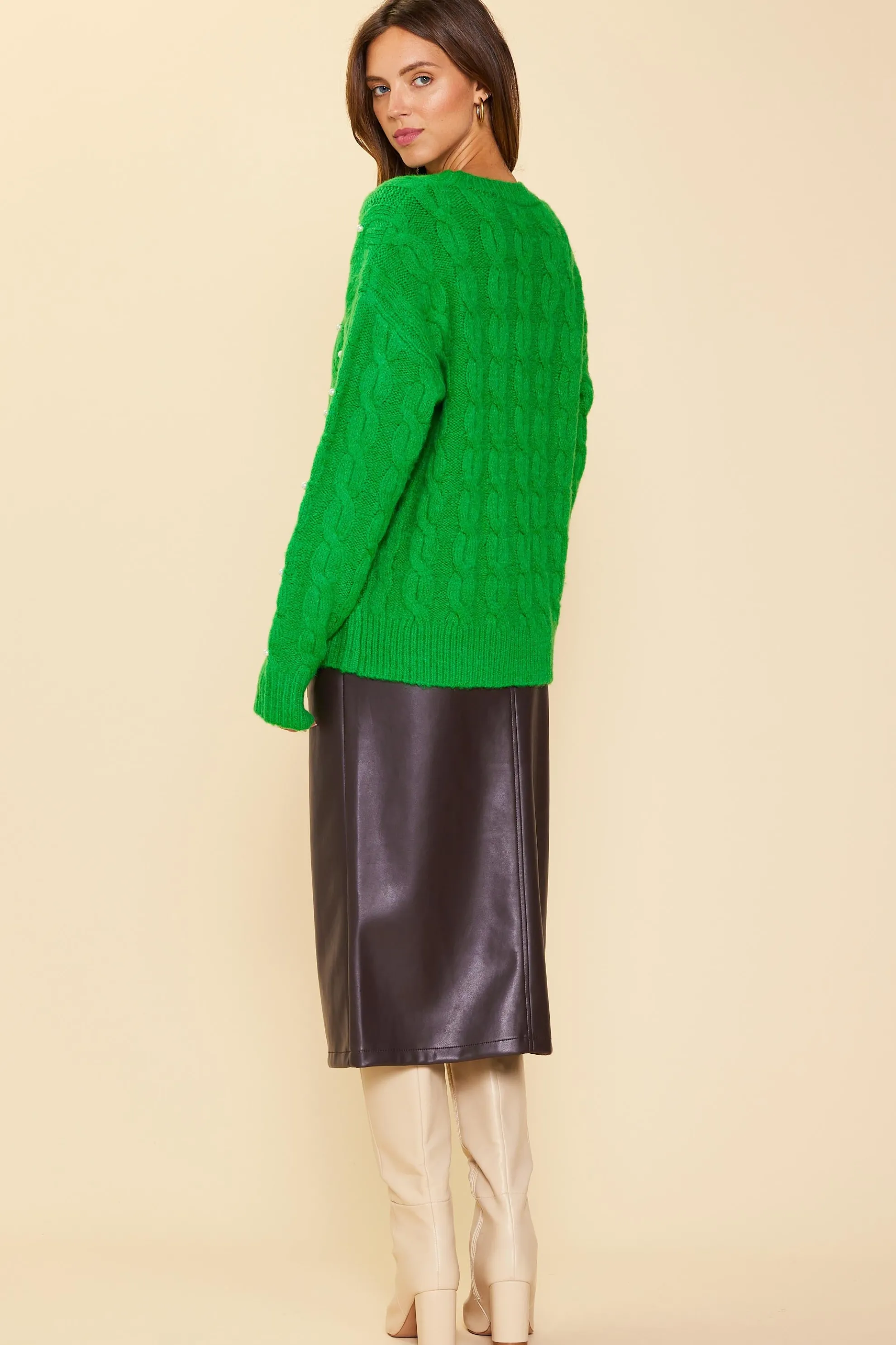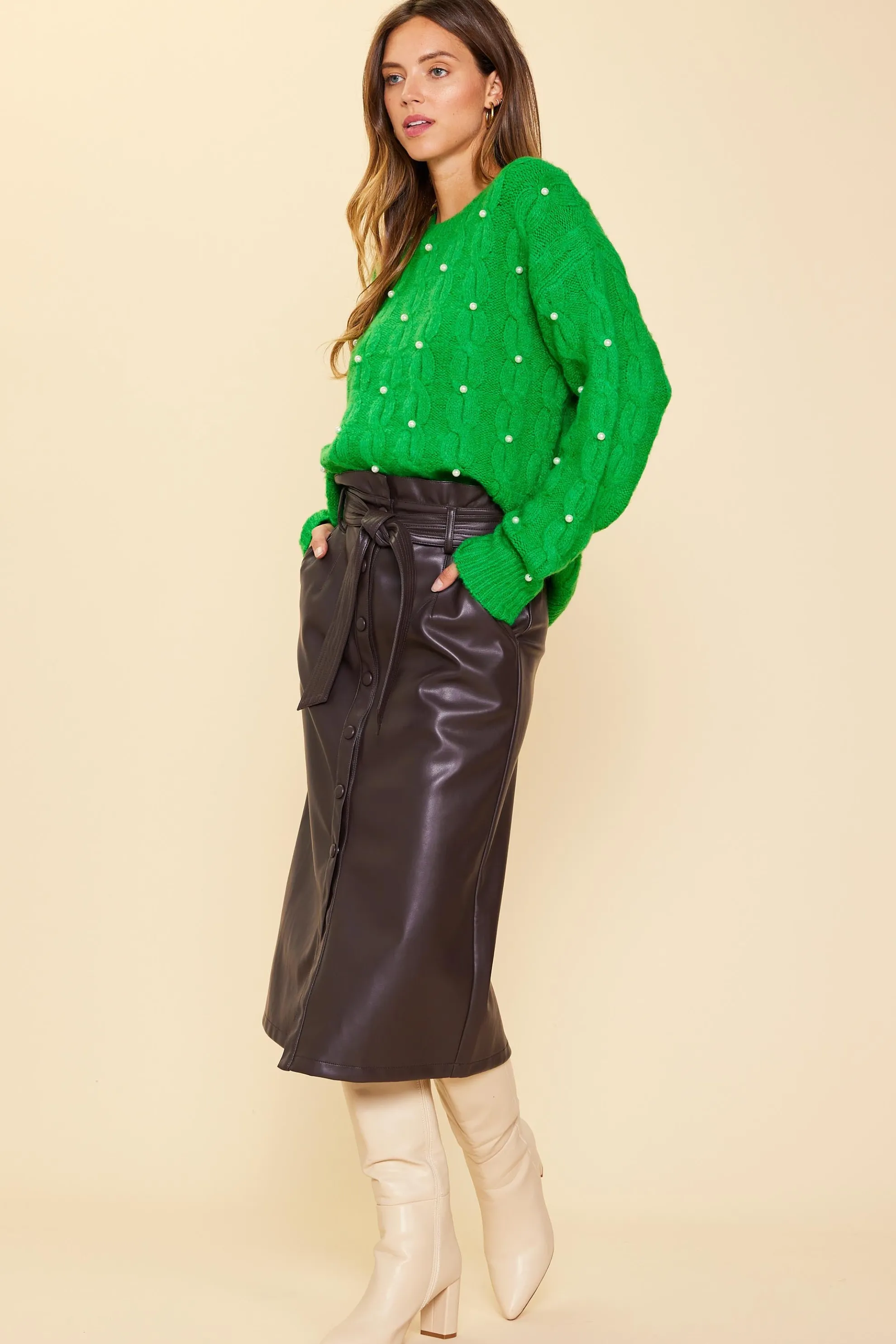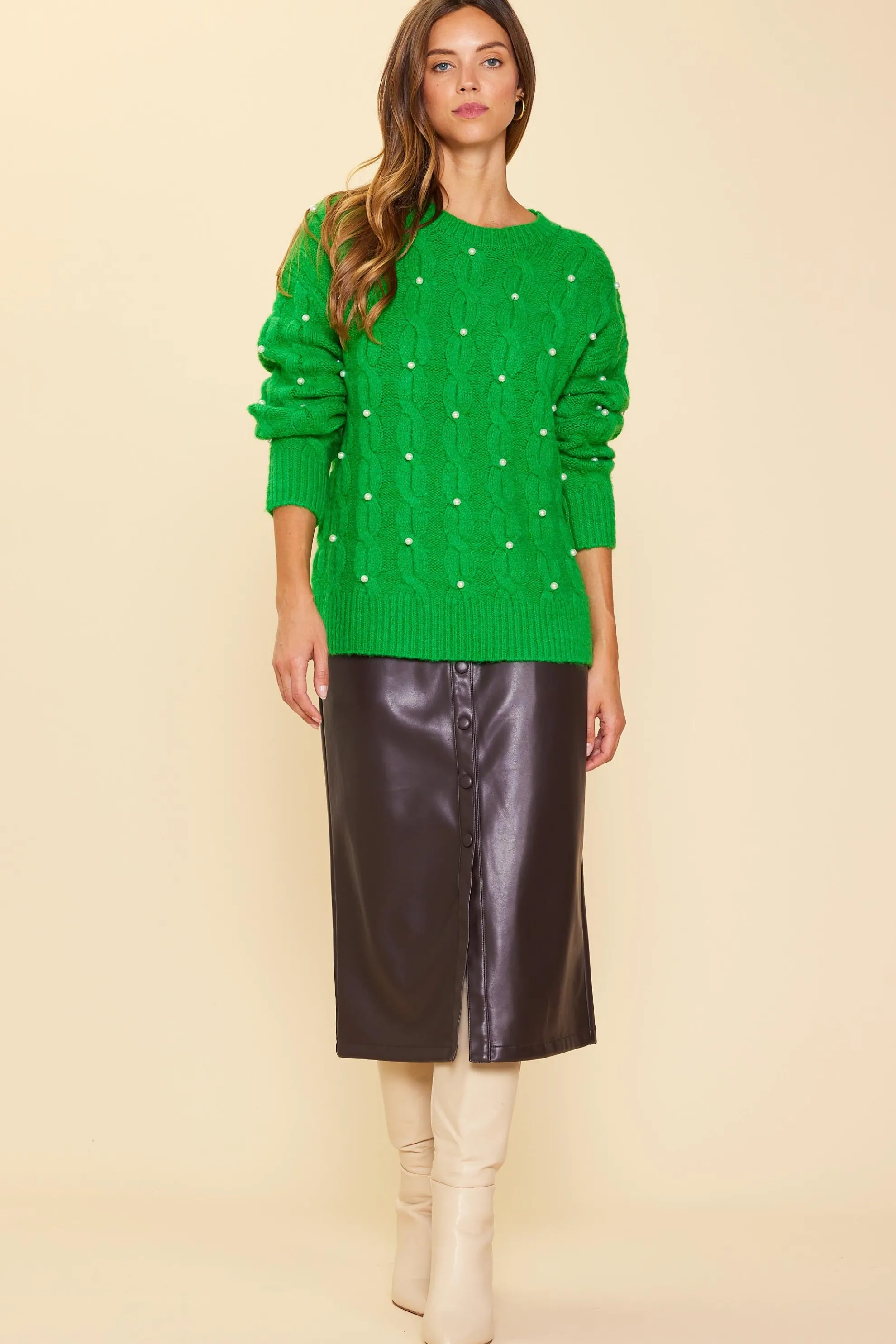 Faux-pearl embellishments dot the cable-knit design of this cozy pullover sweater. It’s a whimsical way to dress up a pair of jeans or pair with a slinky skirt.