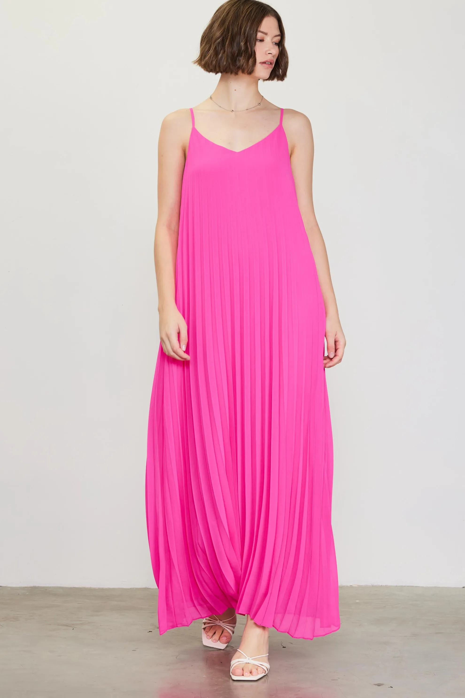 Simple yet striking, this strappy maxi dress has a loose, languid silhouette of flowing pleats that drop to the floor. It’s accented by a slim strap that crosses the back.
