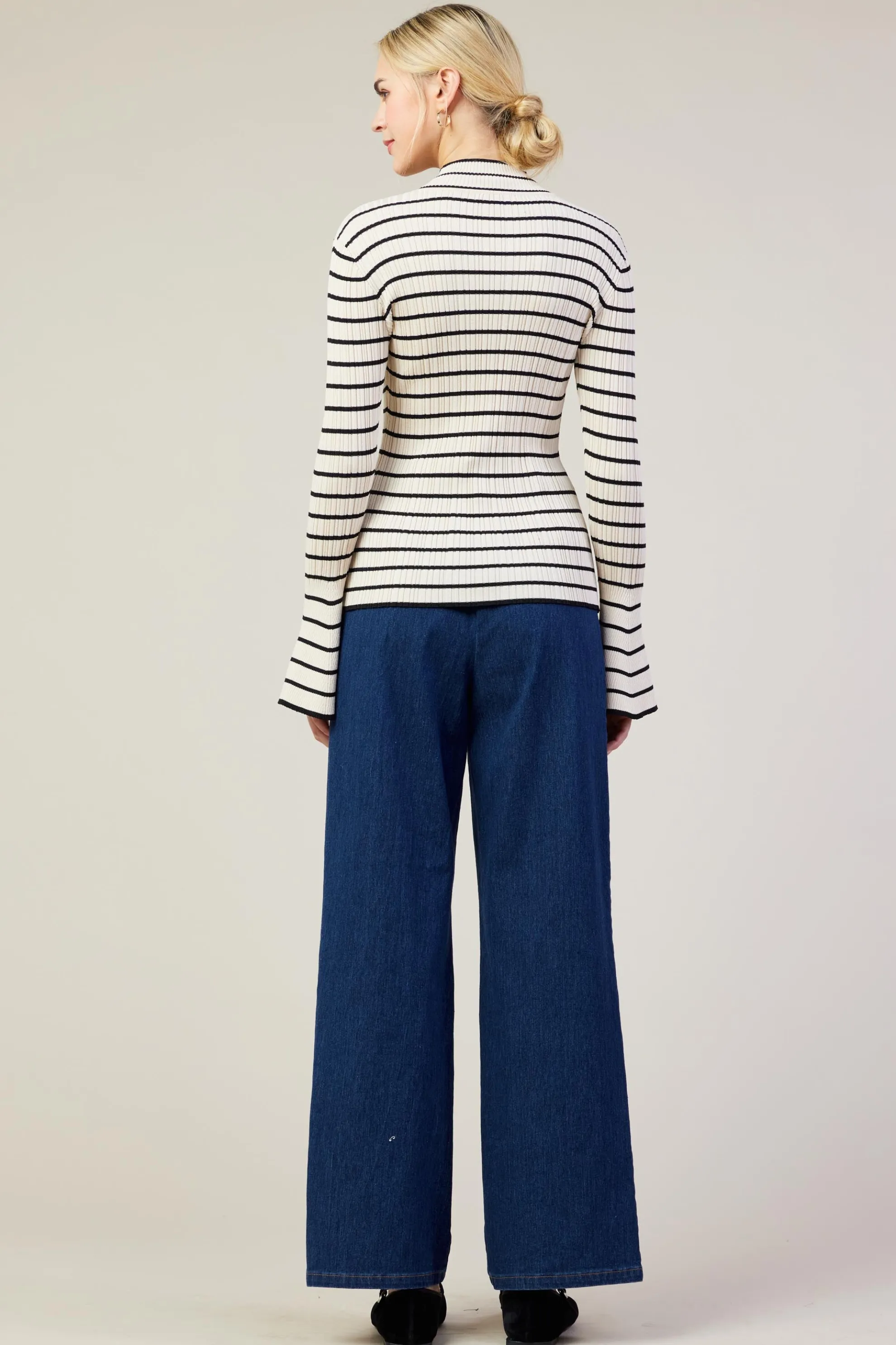 Flared sleeves add just the right amount of drama to this slim-fitting ribbed top. The mock-neck style is knitted with slender stripes in black and cream.