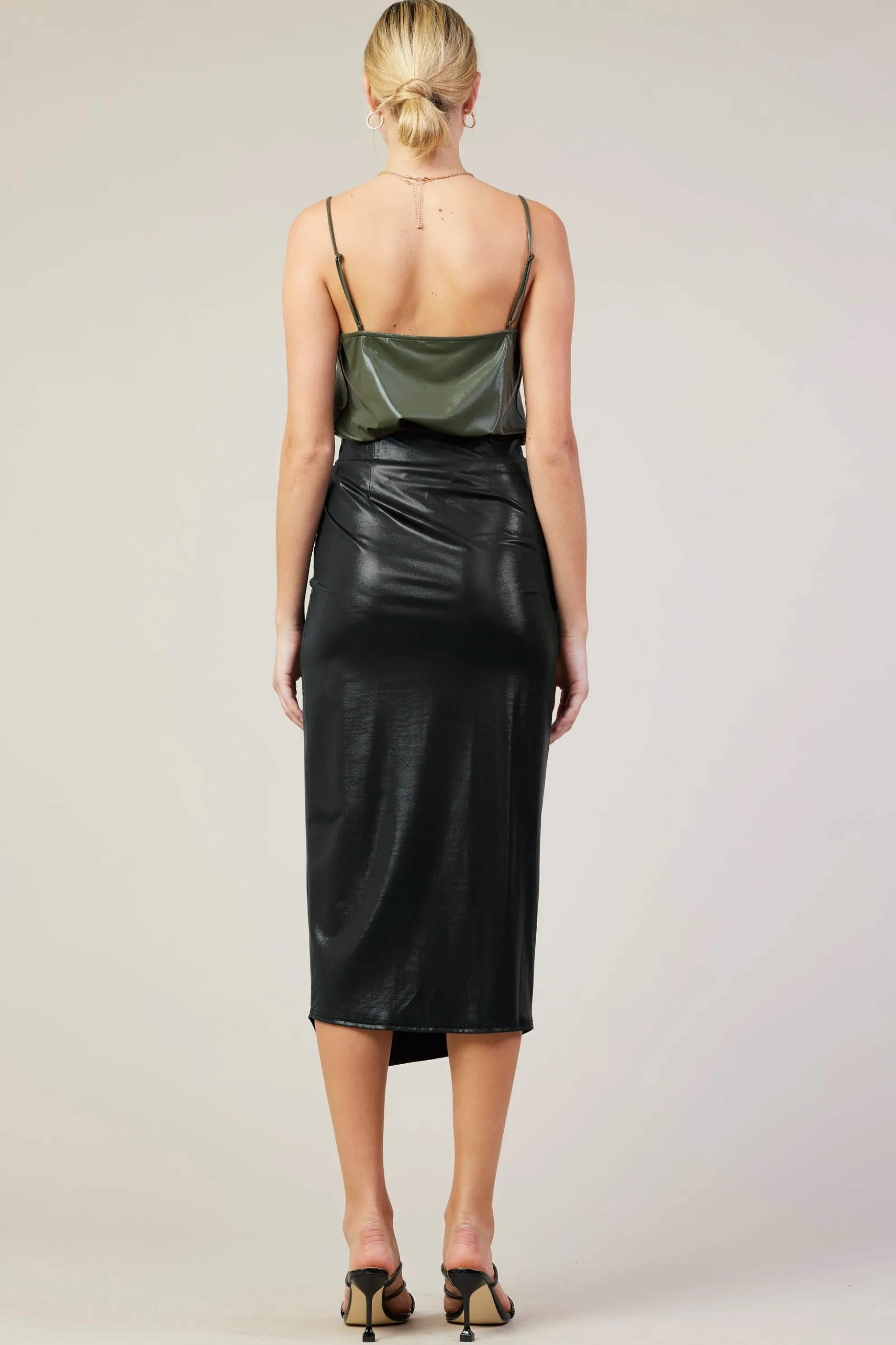 Sleek and lustrous, this black midi skirt has a wrap-style overlay with a tonal O-ring and a knotted sash. Sitting high on the natural waist, it glides against the body and has a sexy split at the front before landing at a slightly angular hem.