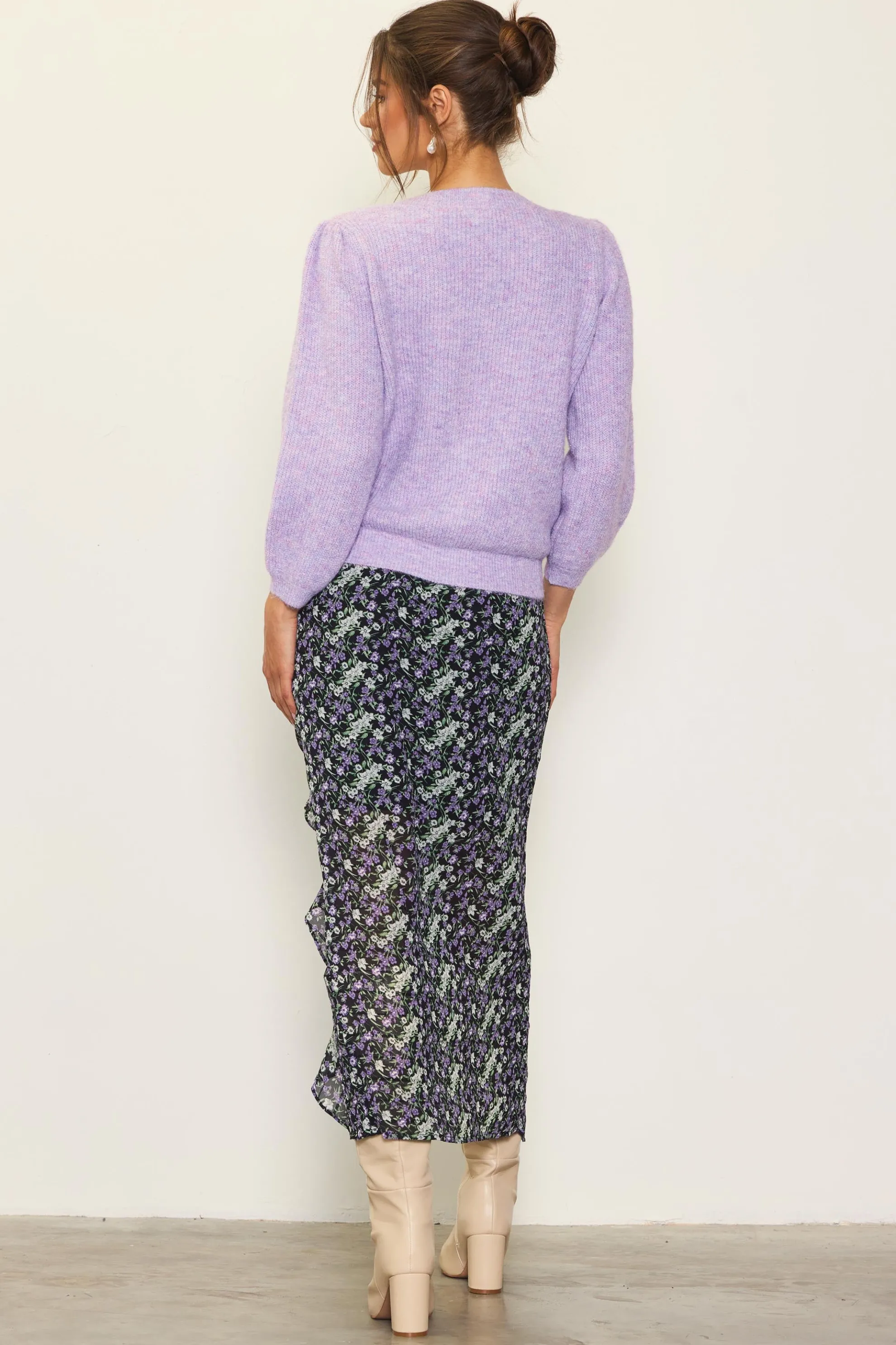 Ruffles cascade down the front of this floral-print midi skirt, adding movement to the shin-skimming silhouette. Made from sheer jacquard that’s woven with a subtle stripe pattern, the style sits high on the waist and features an alluring front slit.