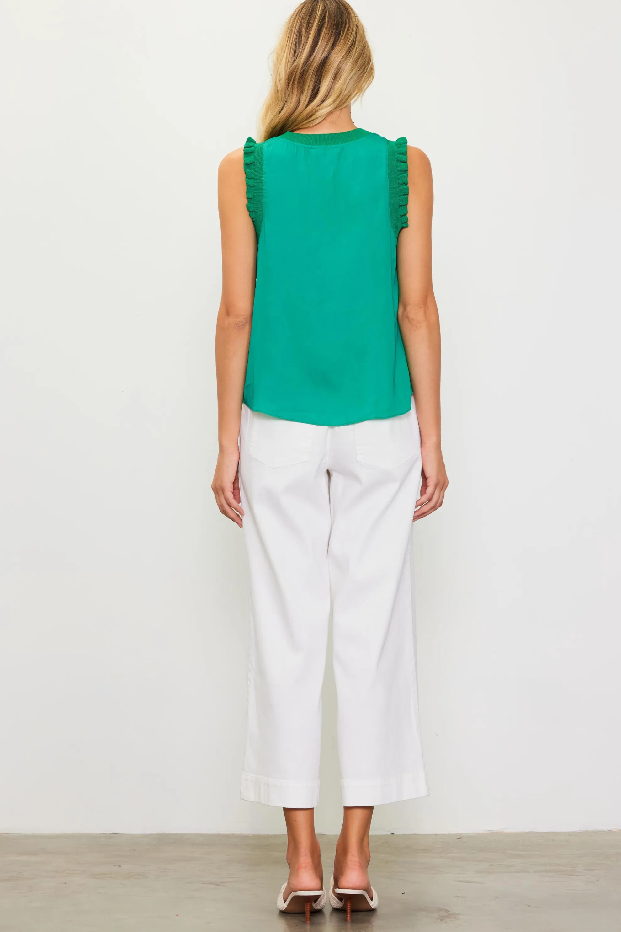 Rib trim and ruffle detailing accent this sleeveless woven top. It’s simple and relaxed with a bit texture contrast.