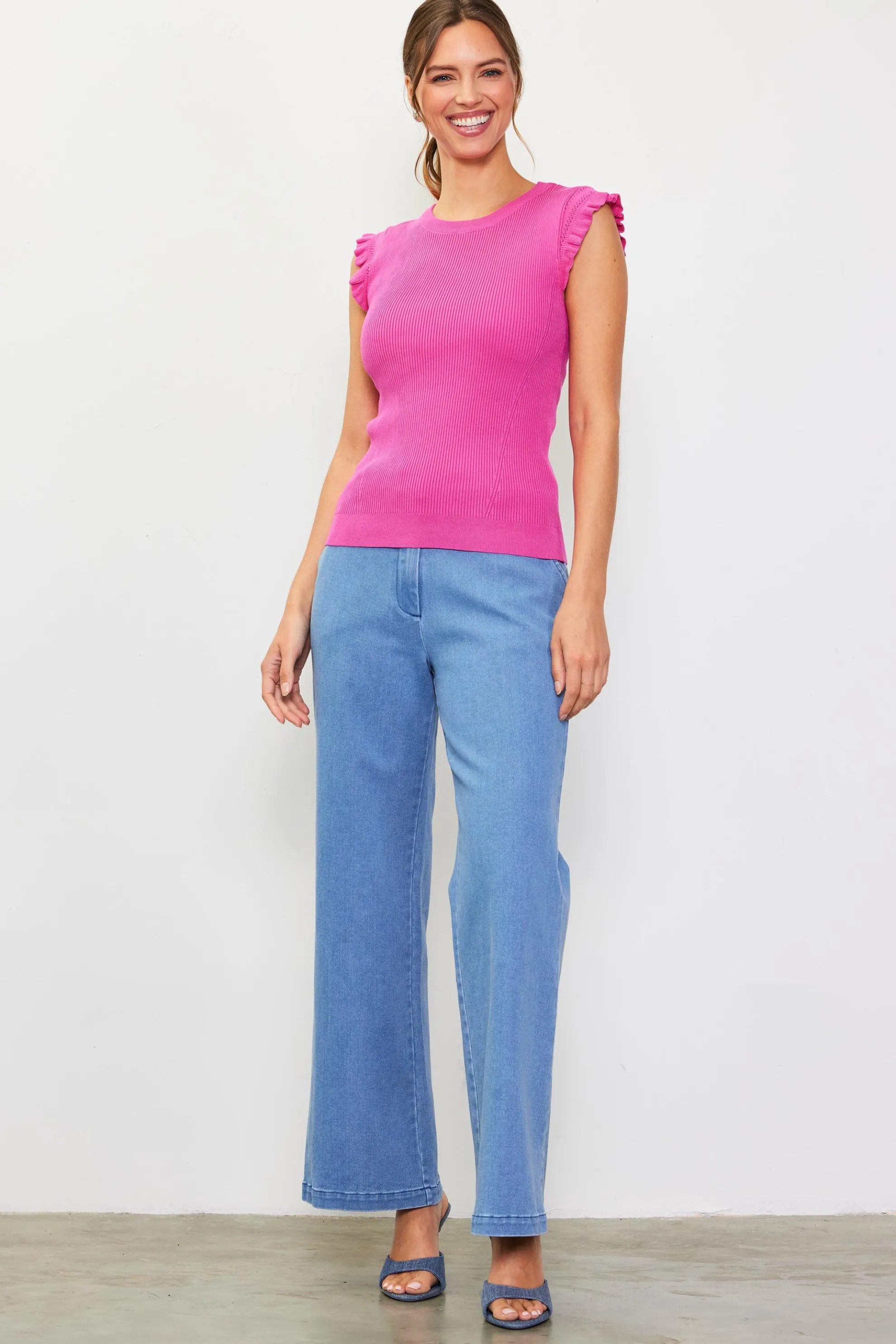 The perfect stand-in for the everyday tee. Made from a comfortable rib knit, this top fits close to the body and features ruffled cap sleeves with pointelle detailing.