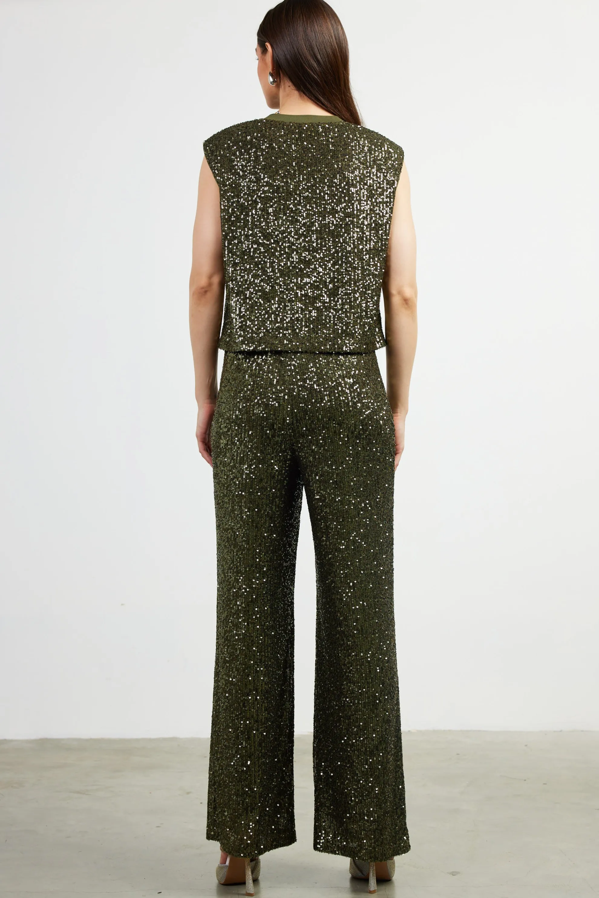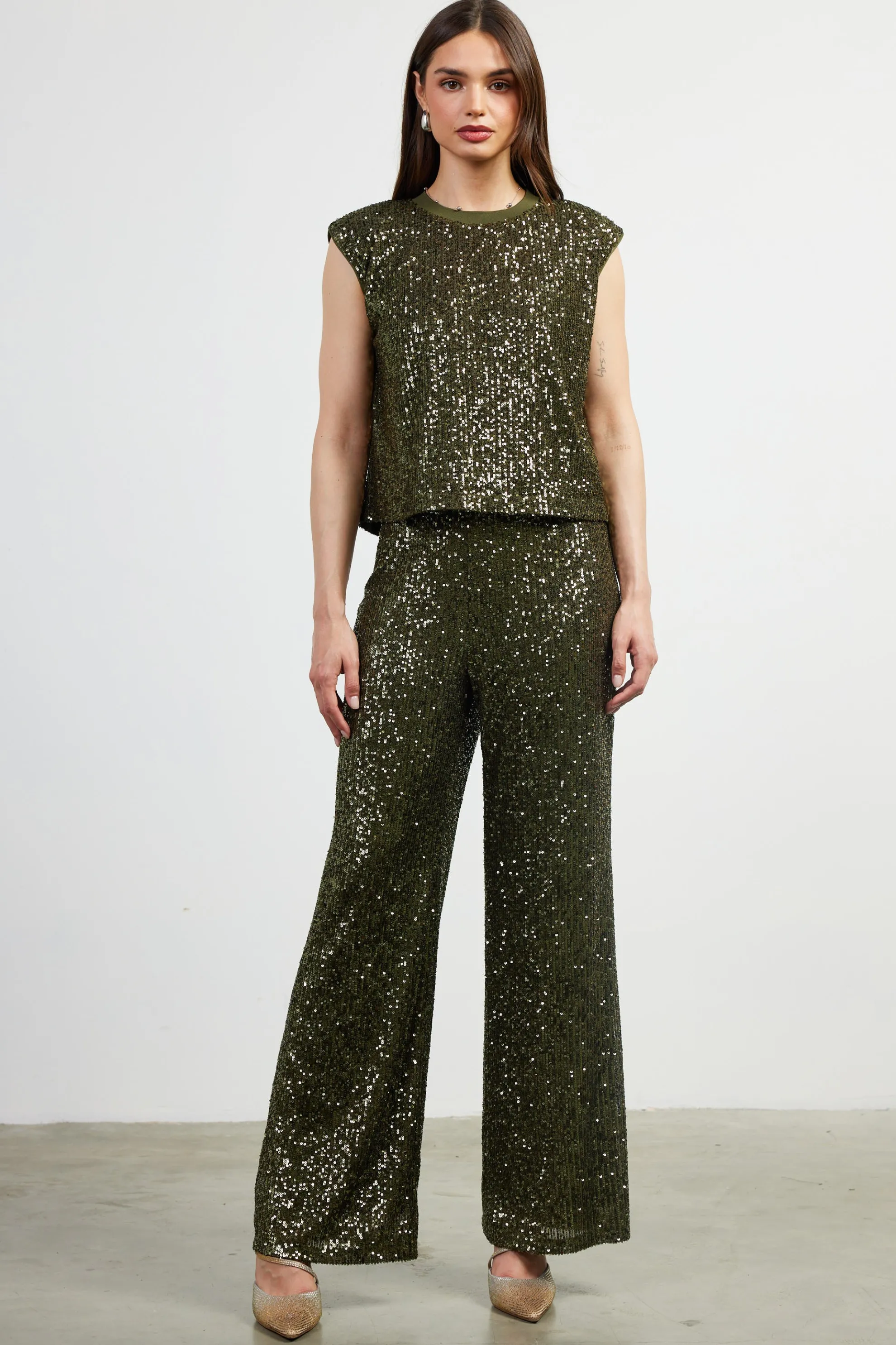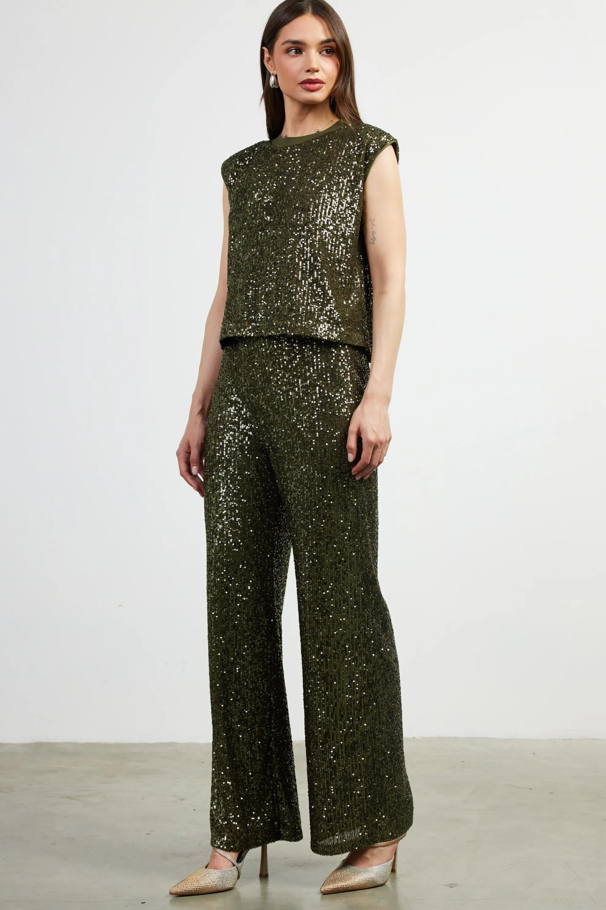 Adorned with thousands of tiny sequins, this boxy muscle top has sparkle aplenty. A ribbed neckline and structured shoulders define the shape.