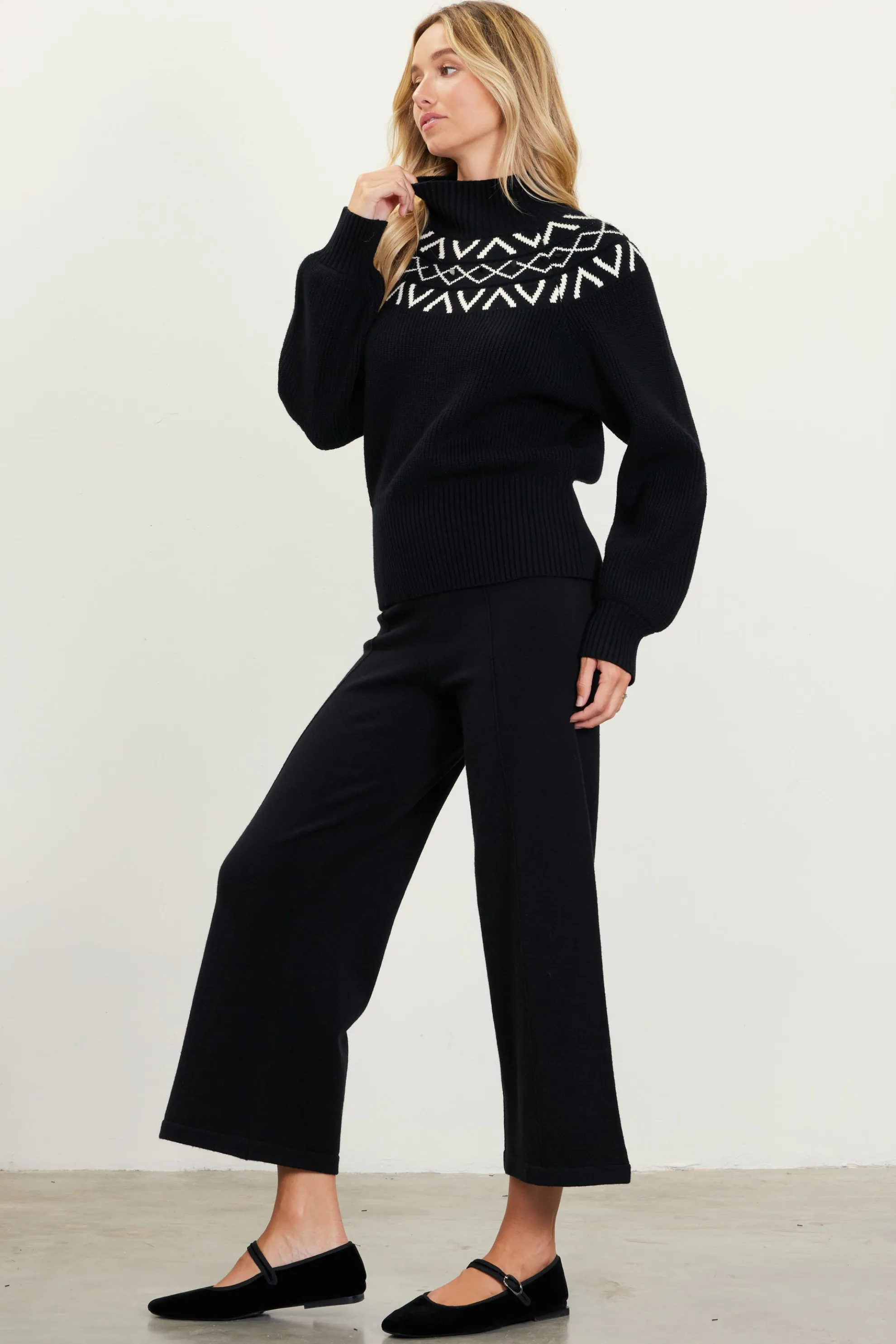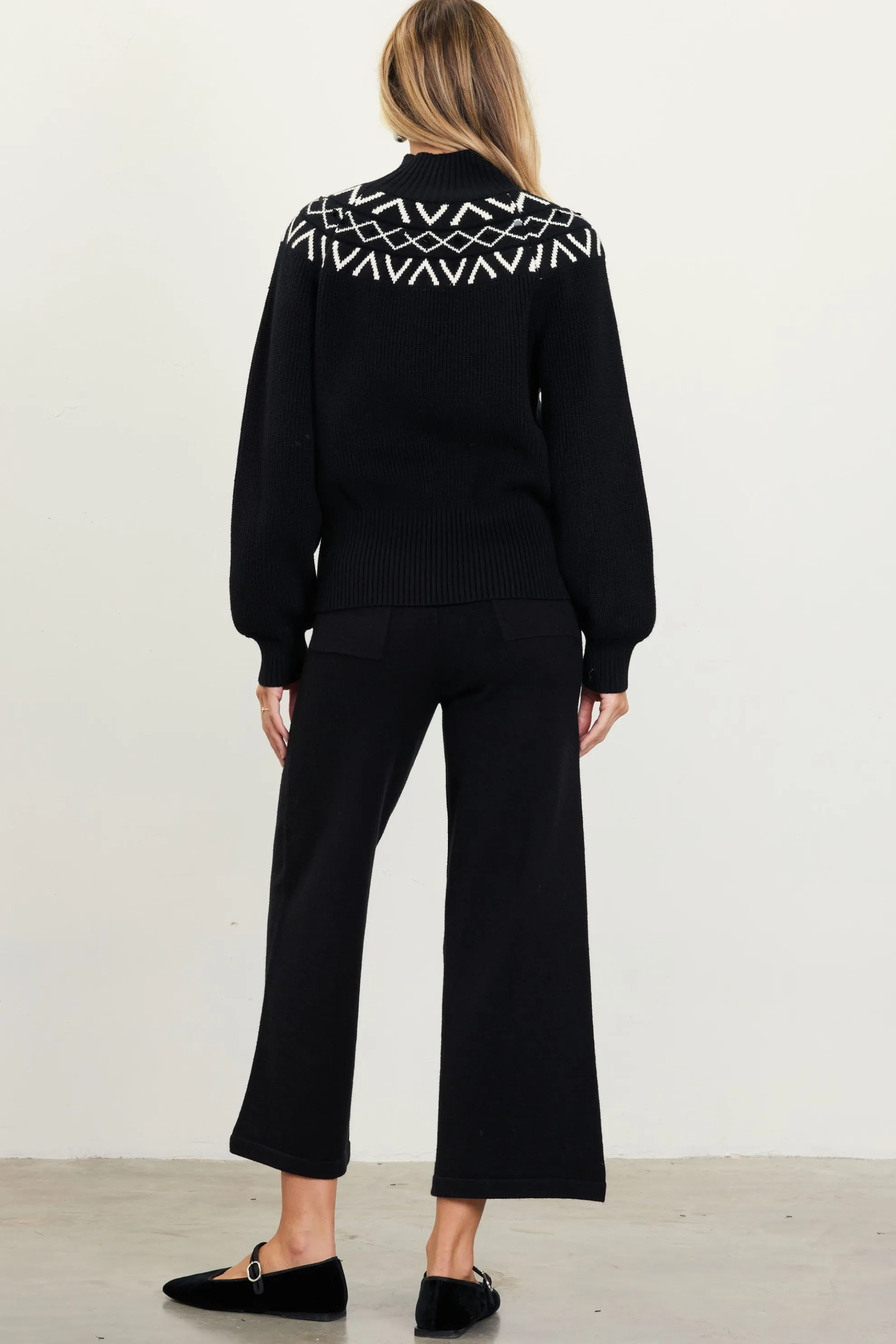 A simple, pared-back take on the fair isle sweater. Done here in black and white, it’s been knitted for a ribbed texture and accented by light-catching sequin discs.
