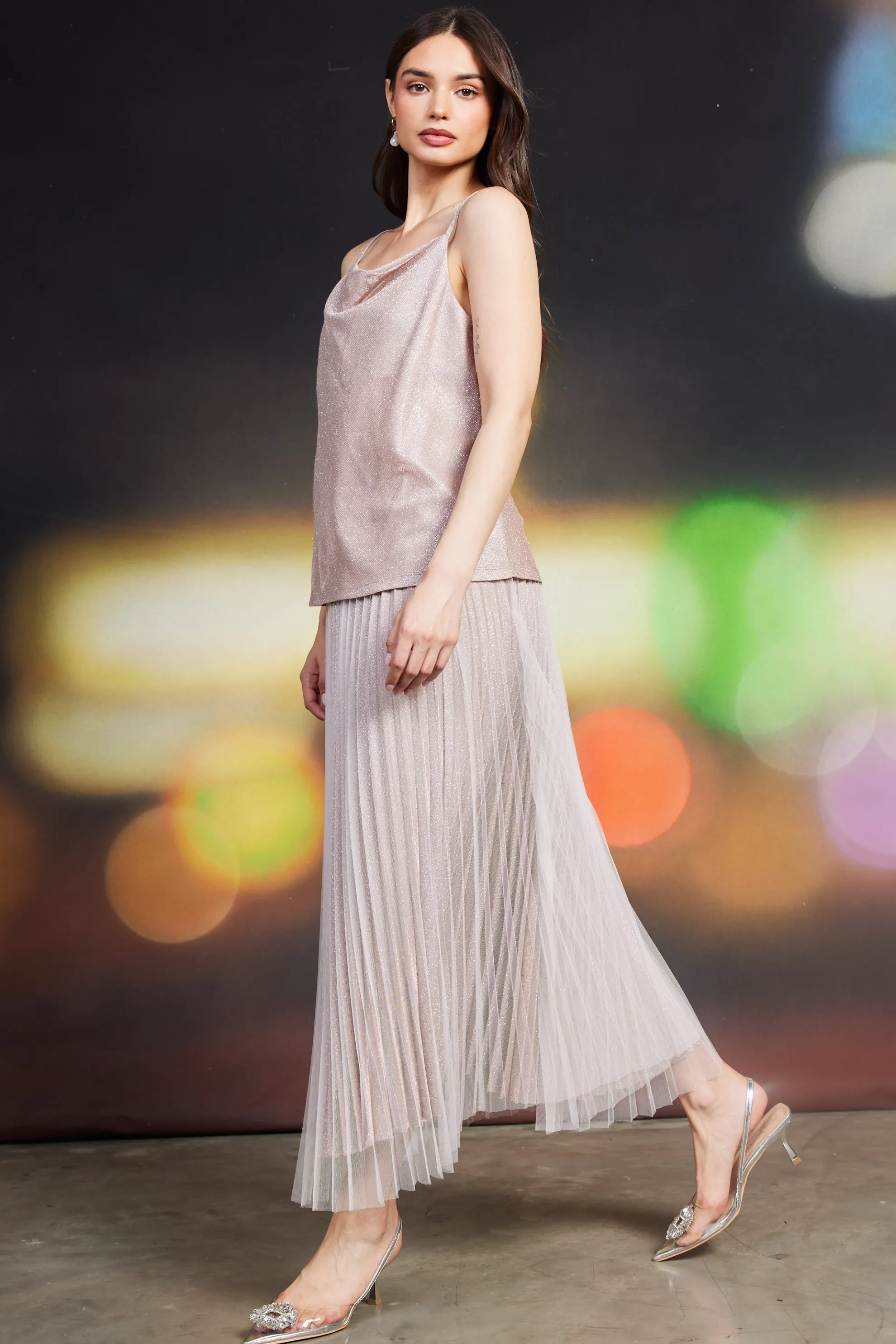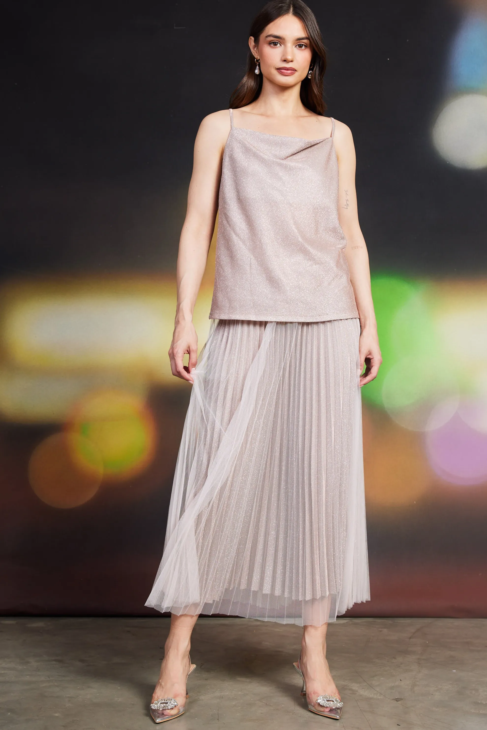 A draped cowl neckline adds to the allure of this glimmering cami top. Cut on the bias for a figure-skimming fit, it’s slinky and minimalist with adjustable spaghetti straps.