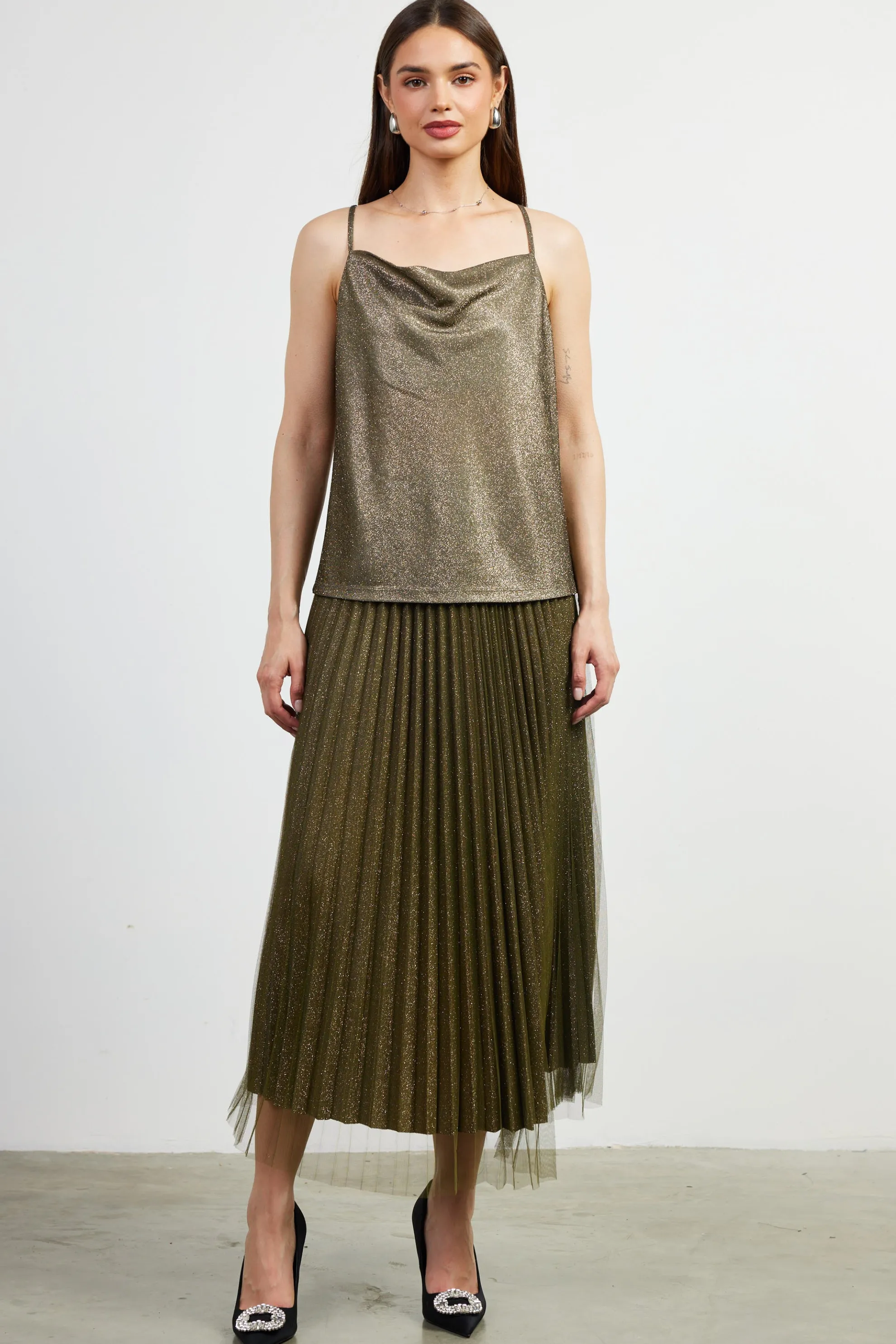 A draped cowl neckline adds to the allure of this glimmering cami top. Cut on the bias for a figure-skimming fit, it’s slinky and minimalist with adjustable spaghetti straps.