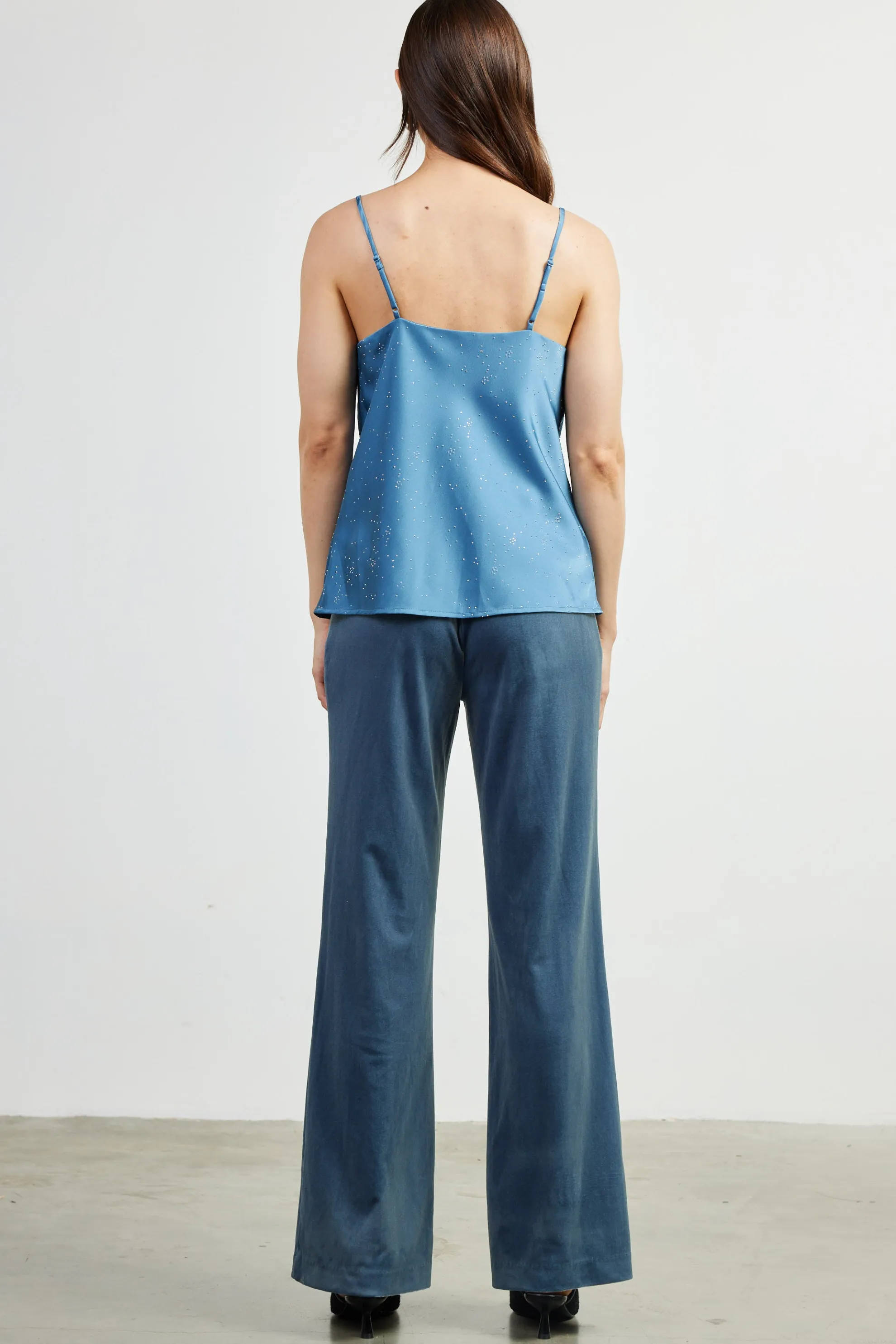 Tiny silver stones glimmer on this satin cowl-neck cami top. Accented by adjustable spaghetti straps, it’s got a slightly relaxed fit with a graceful drape.