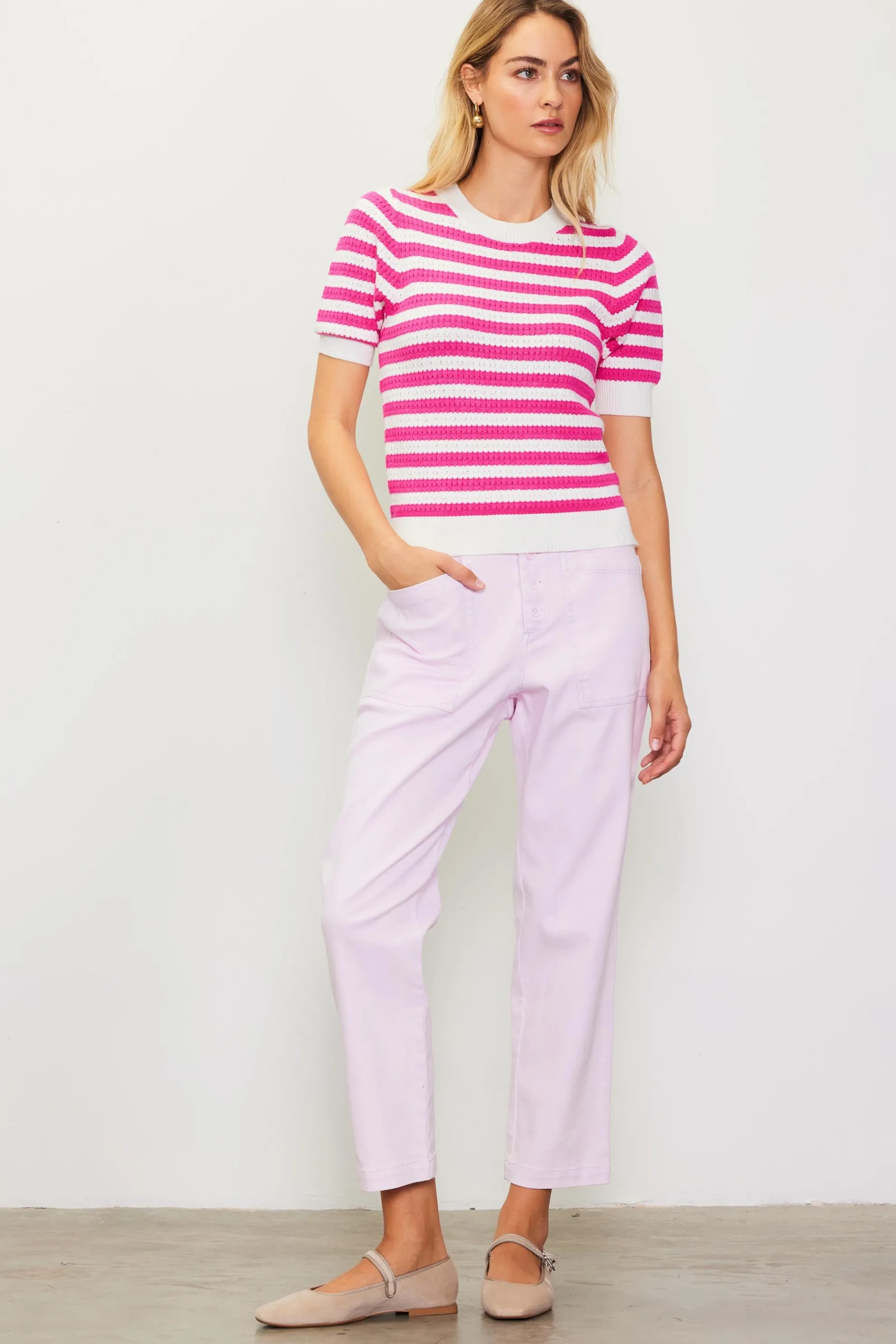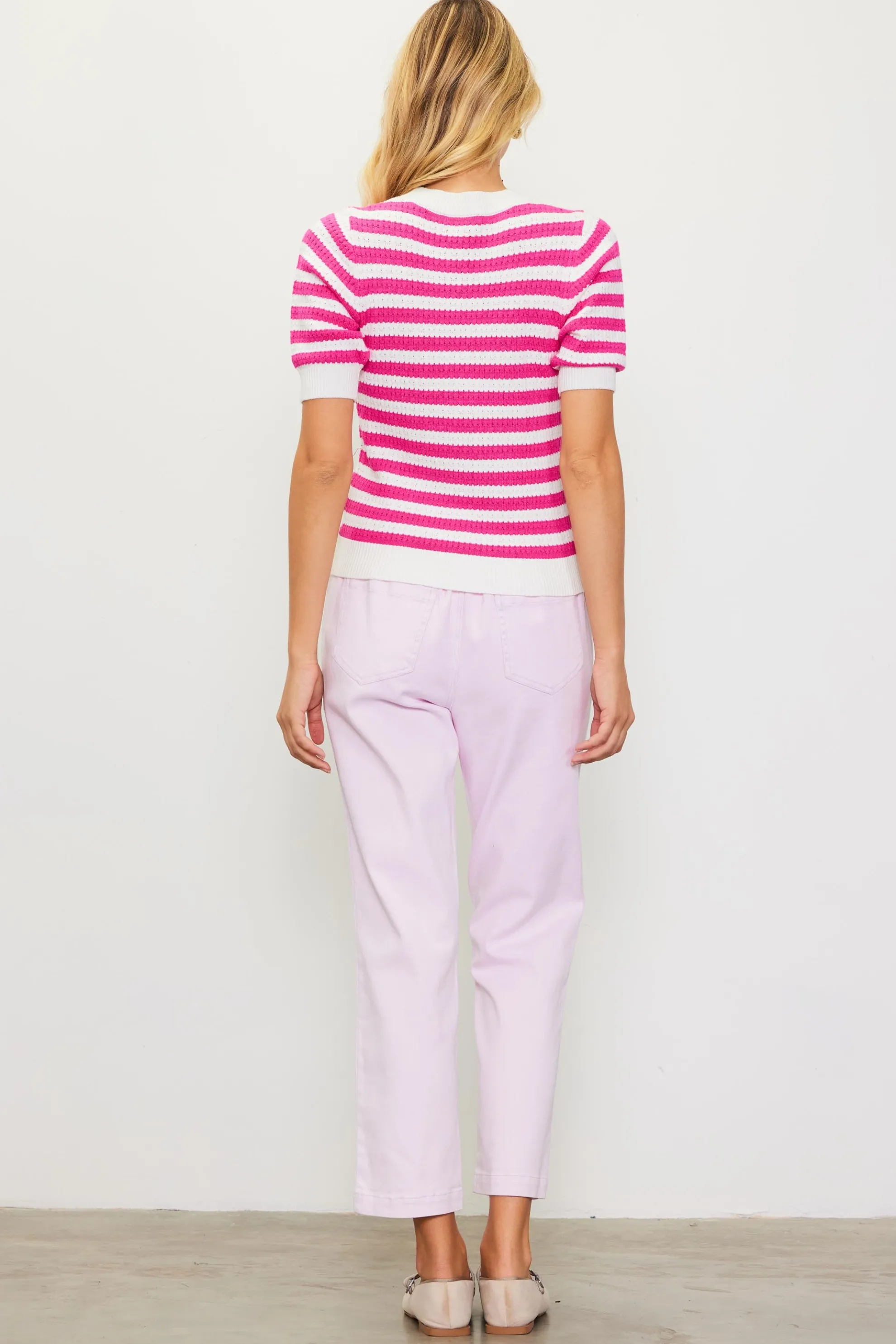 The perfect striped sweater to wear on holiday. It’s just the right amount of cozy for breezy days in a balmy climate. Slip on this short-sleeve knit with a pair of shorts and sandals.
