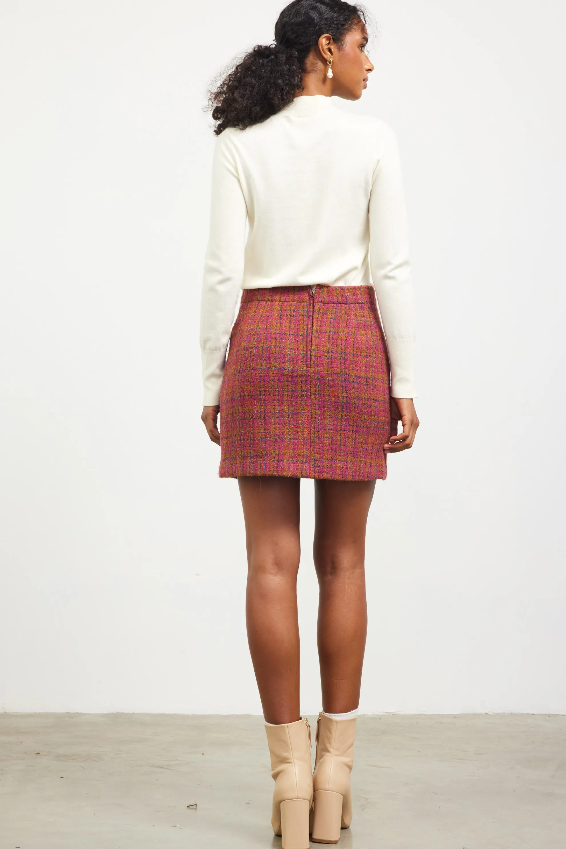 This tweed mini skirt features a check pattern in rich, autumnal colors. Cut for a closer fit, the silhouette is designed with a high waist and a little slit at the front.