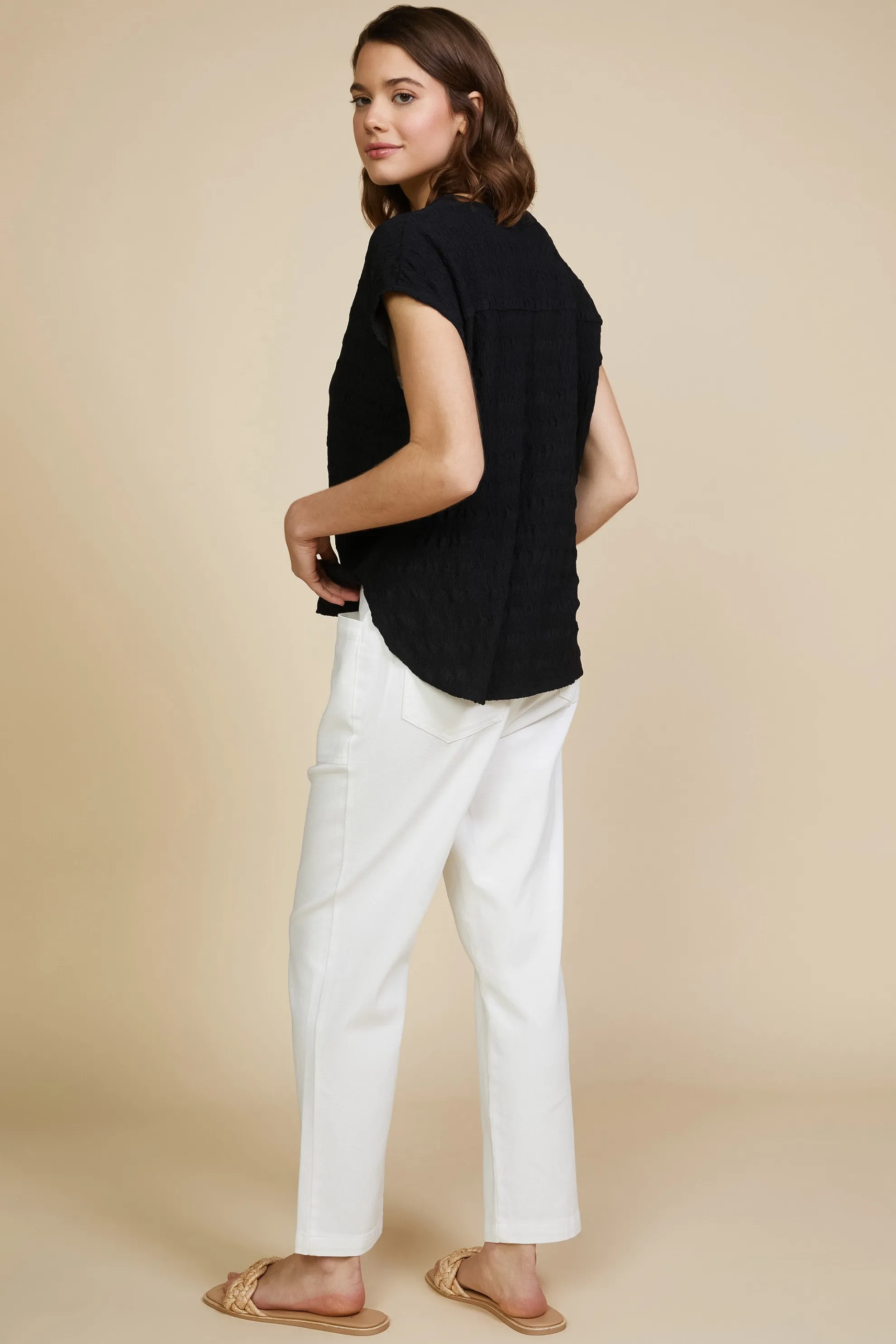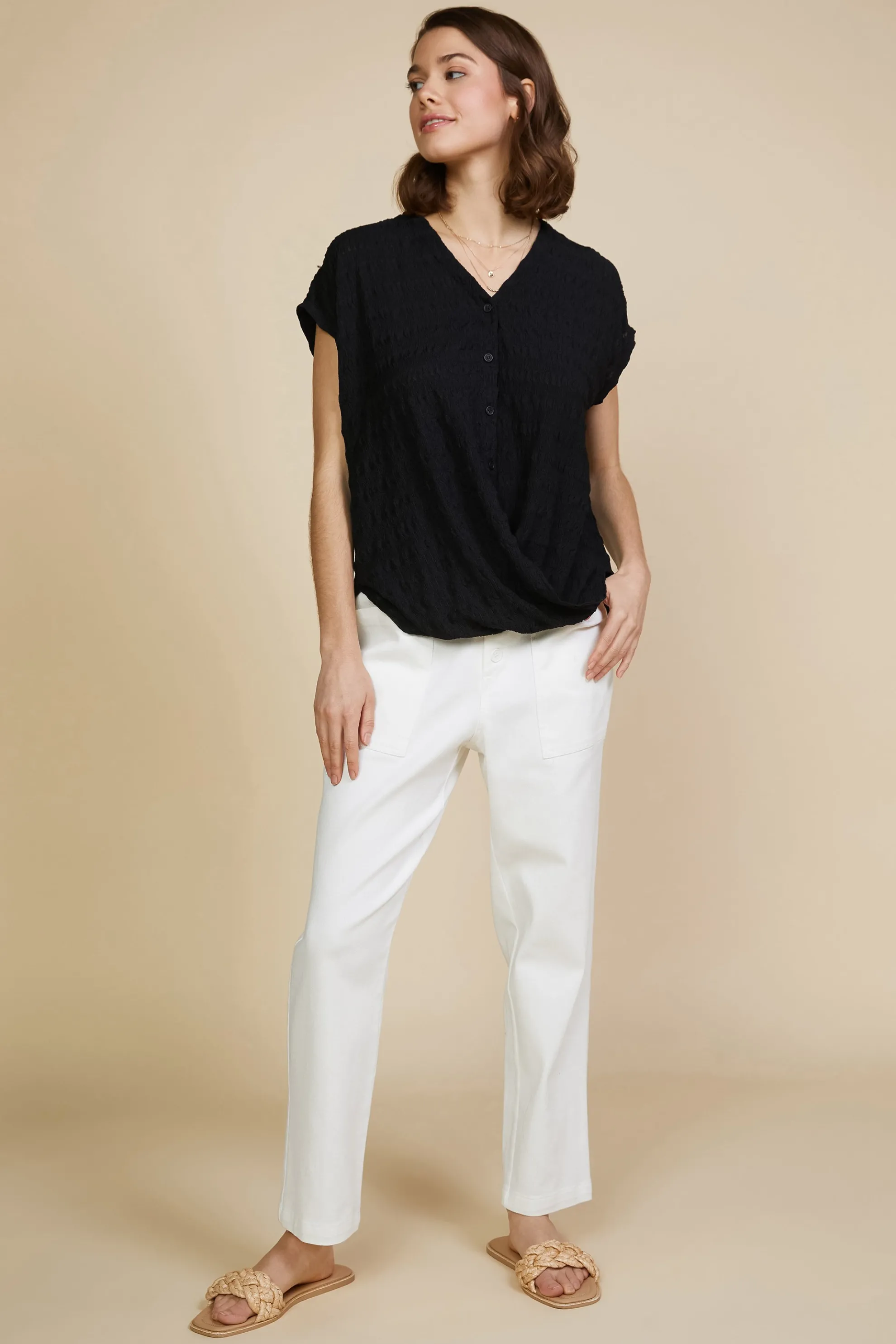 Textured stripes add tonal dimension to this surplice-style blouson. It’s relaxed and graceful, finished with buttons at the front and an elegant draped hem.