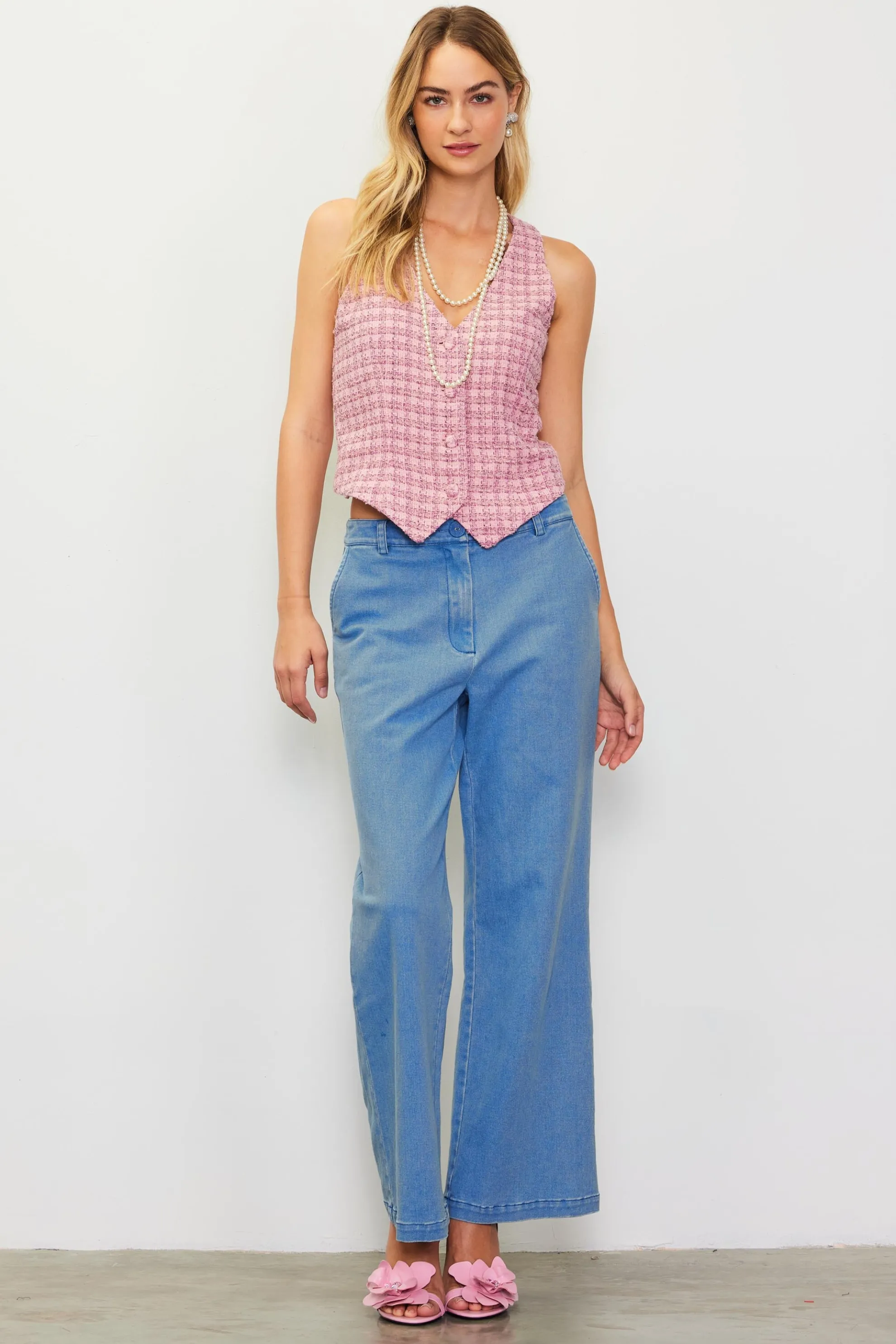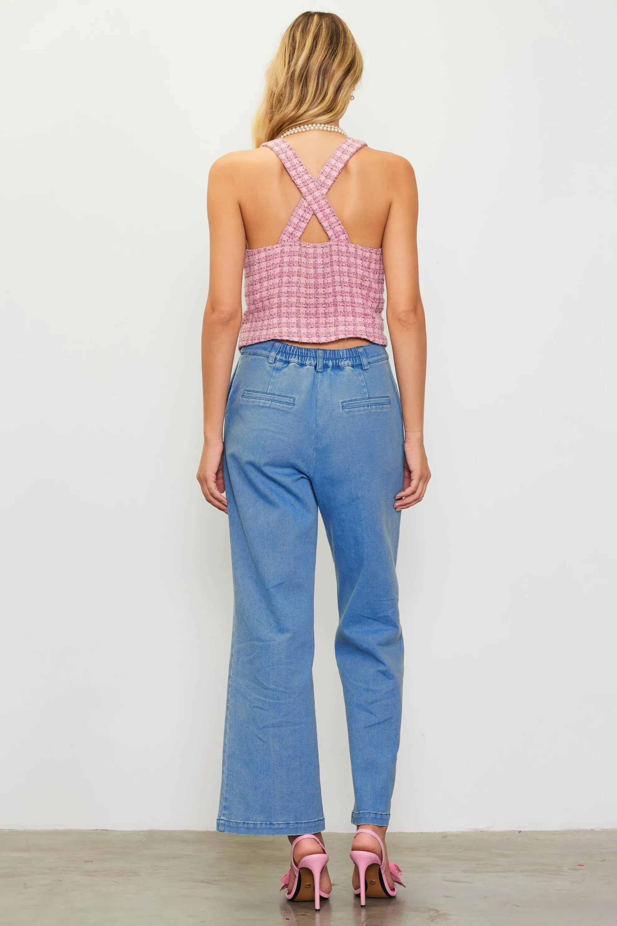 This halter-style vest offers a feminine take on classic tailored style. Crafted from tactile tweed, it’s done in a pale-pink plaid and features covered buttons at the front. It’s the perfect complement to our matching shorts, but it pairs equally well with jeans or crisp white pants.