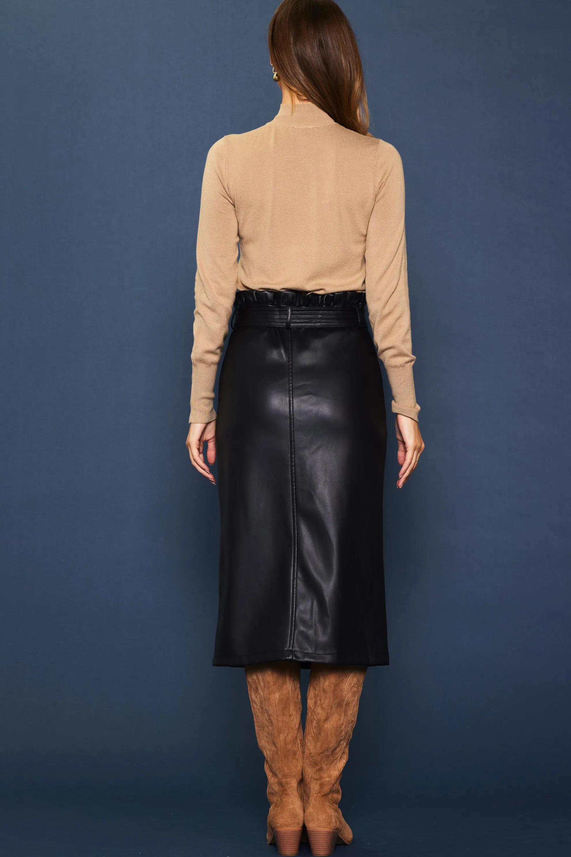 Sleek and supple, this vegan leather midi skirt has an elasticized paperbag waist, a shape-defining tie belt, and tonal snaps at the front. Complete with concealed hip pockets.