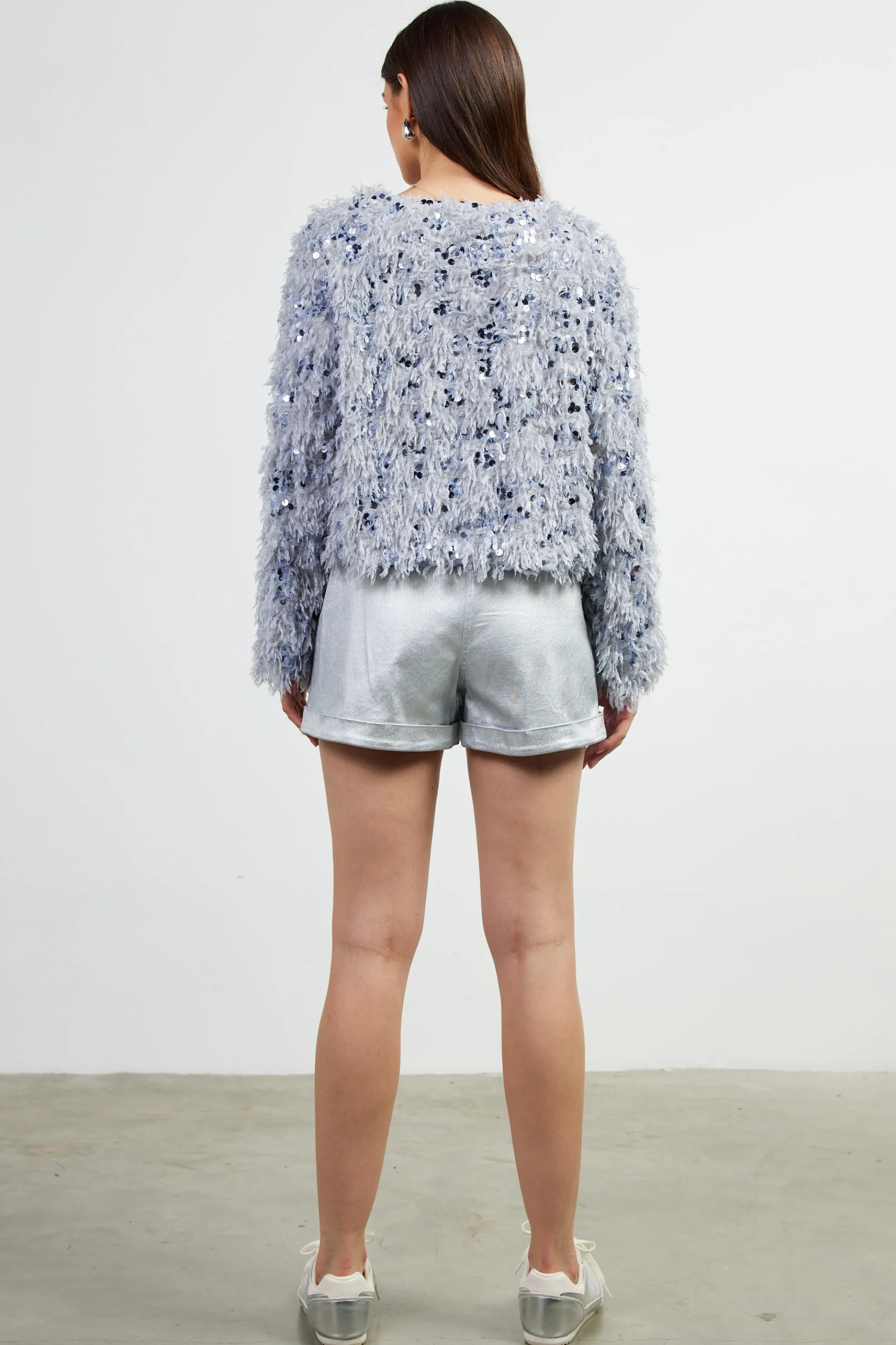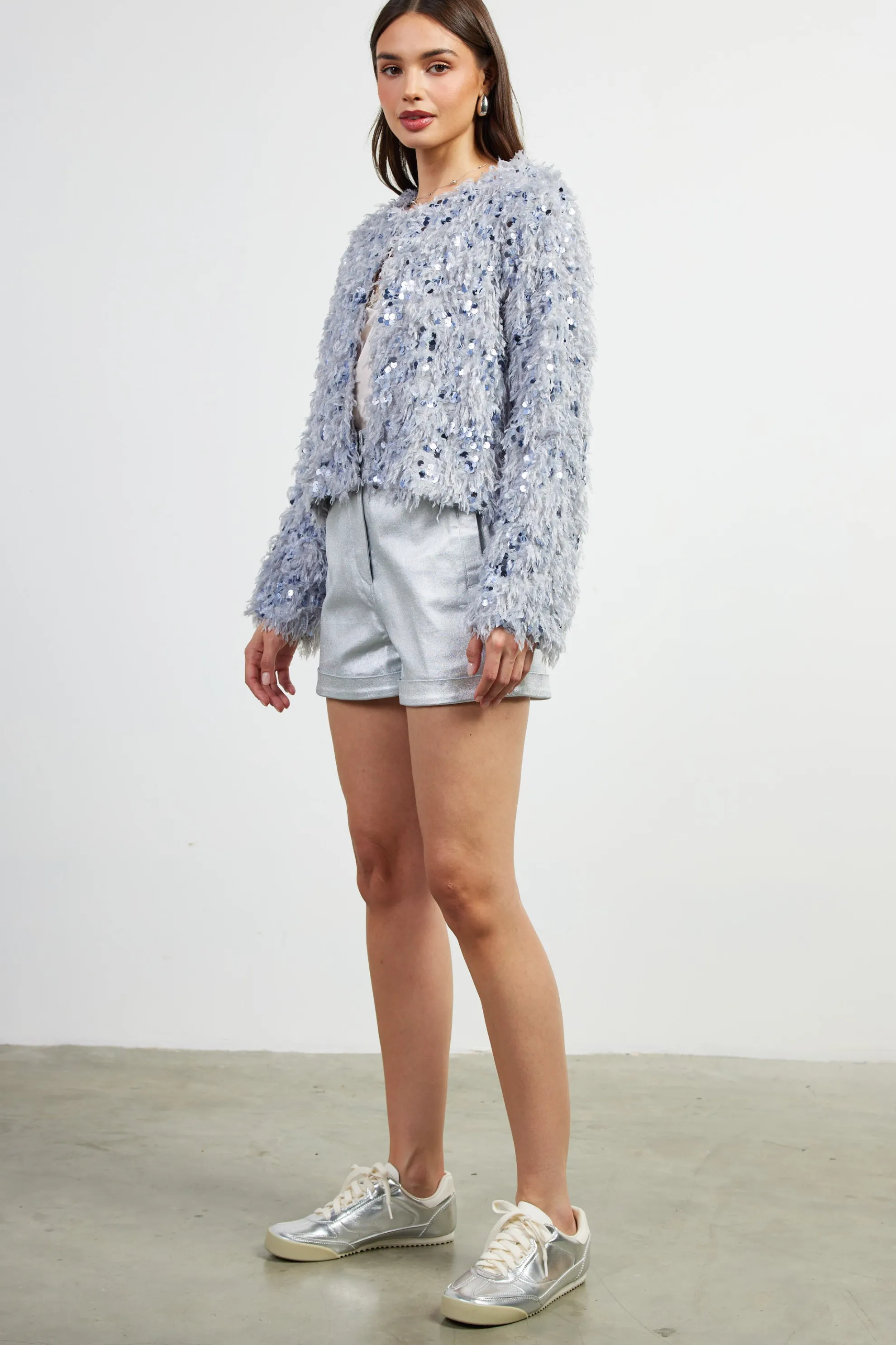 Glimmering paillettes are strewn against fringy feathers on this cropped jacket. It’s an instant outfit booster that’s perfect for parties.